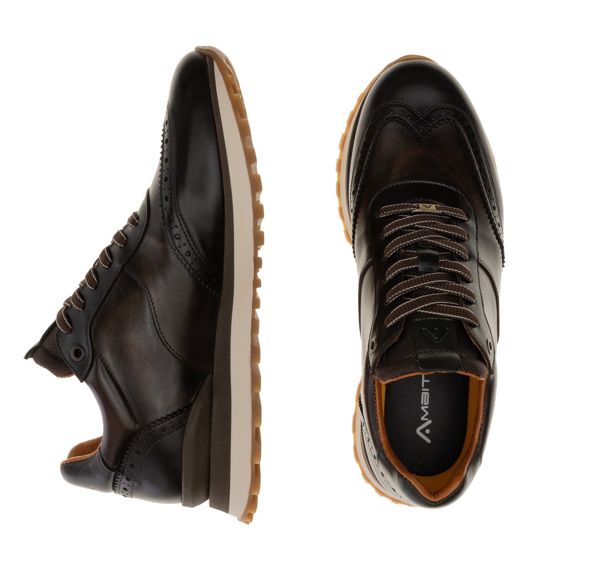 PARK is a new casual hybrid sneaker, combining a sportive runner silhouette with classic footwear details such as patina effect leather and brogueing. This version features perforated details on the uppers, tricoloured sole and contrasting back panel.