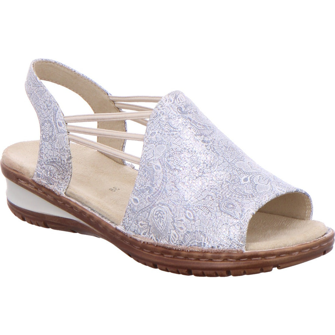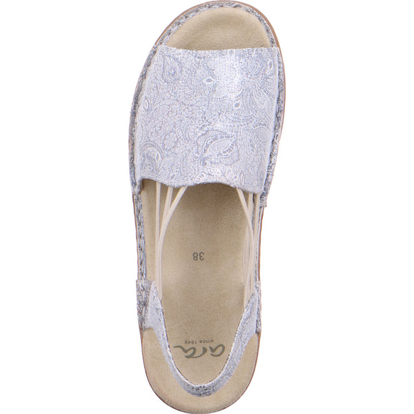 Brings a breath of fresh air into the shoe cabinet: the slightly shimmering sandal from ara. The interior features high-quality leather materials and is evidence of excellent workmanship. Another highlight is the 2 cm high wedge heel which skilfully blends into the successful design. The firmly integrated textile footbed is particularly soft and you can walk on it without worries. Not only the front, wide strap provides perfect support but also the three elastic bands on the side which also characterise the look of this model.