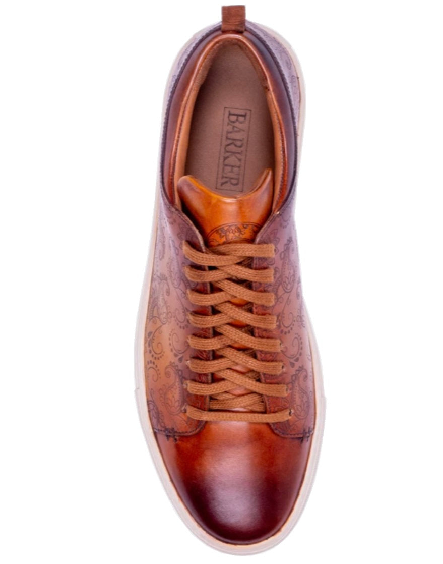 The Paisley Sneaker is a cup sole sneaker that features intricate laser detailing on premium European calf leather. Designed in England and made in India, this sneaker offers a unique and stylish twist to any casual look. The cemented rubber sole with sidewall stitch offers durability and flexibility, while the leather lining provides breathability and comfort. The comfort leather in sock provides extra cushioning for all-day comfort. The standout feature of the Paisley Sneaker is the beautiful paisley laser pattern on the leather upper, giving the shoe a sophisticated and modern look that is sure to turn heads.