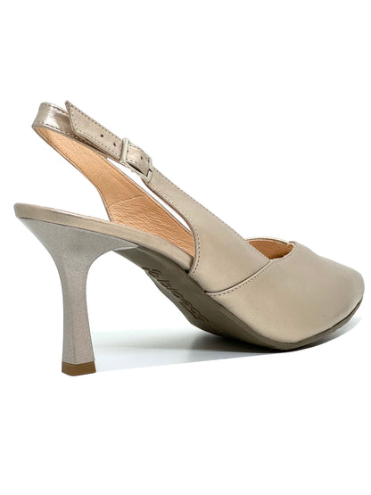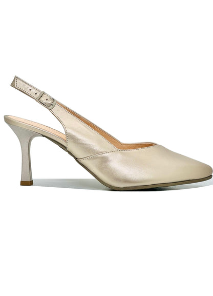 Leather sling back heels with a medium 7cm heel and a soft step insole.