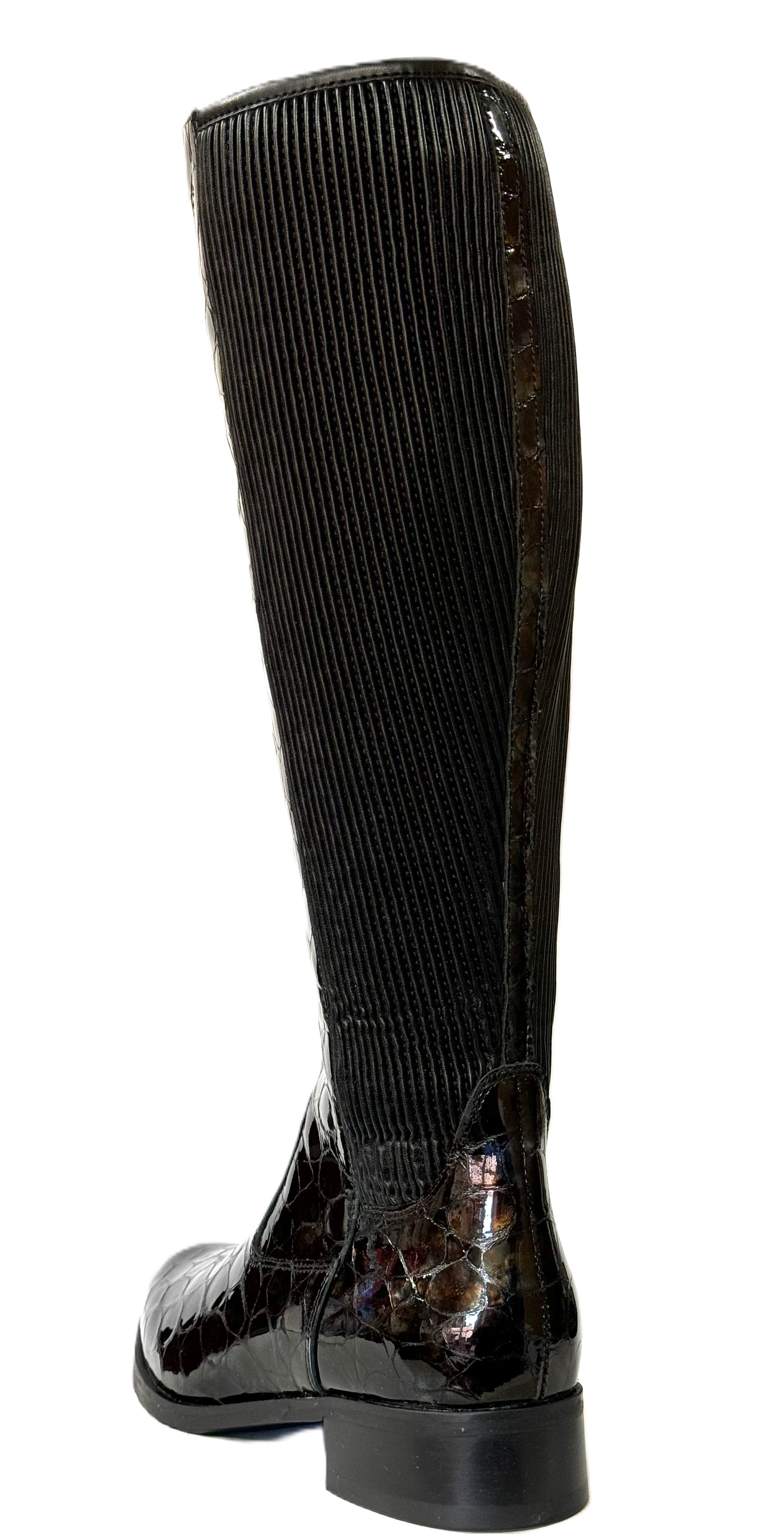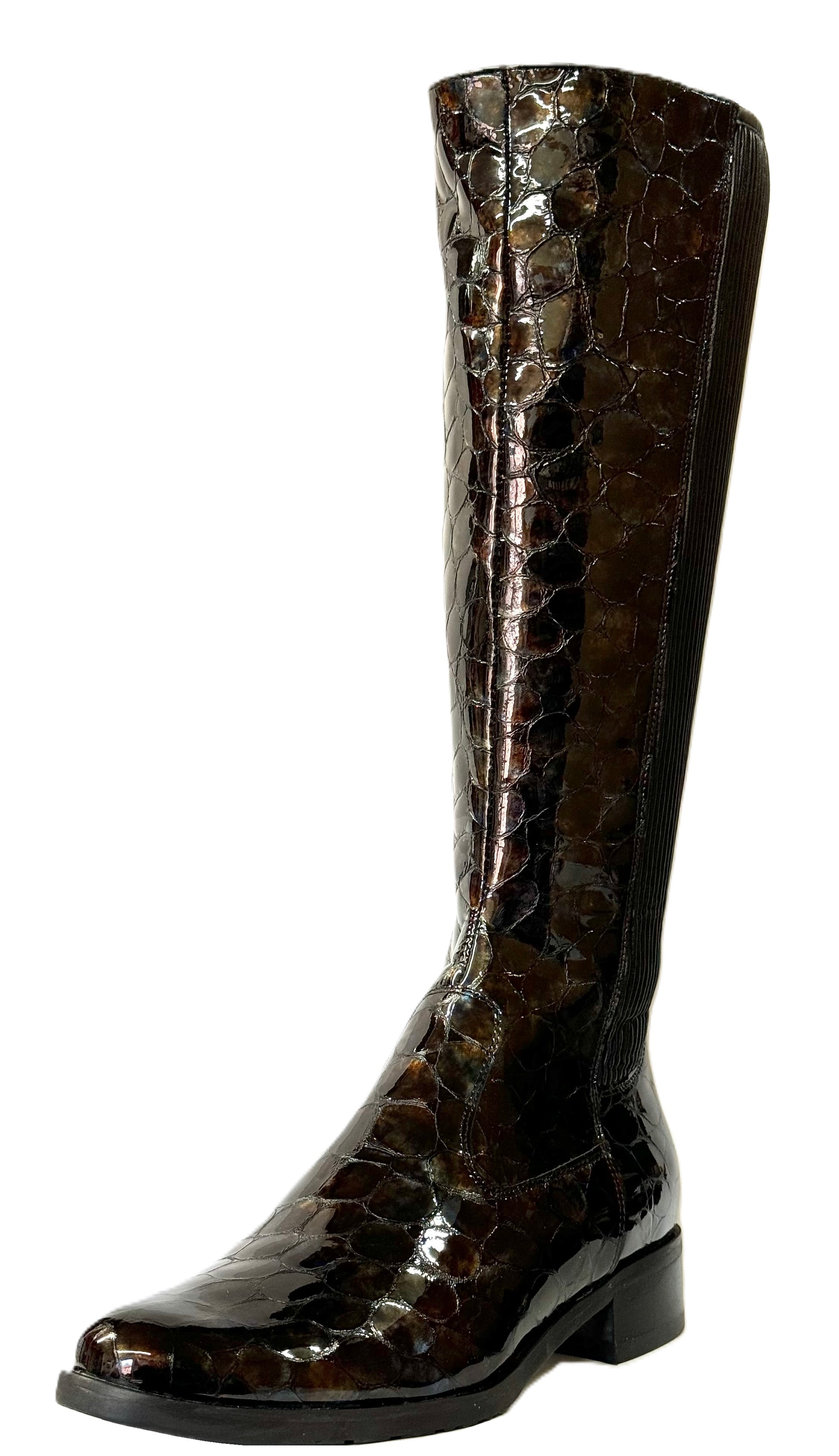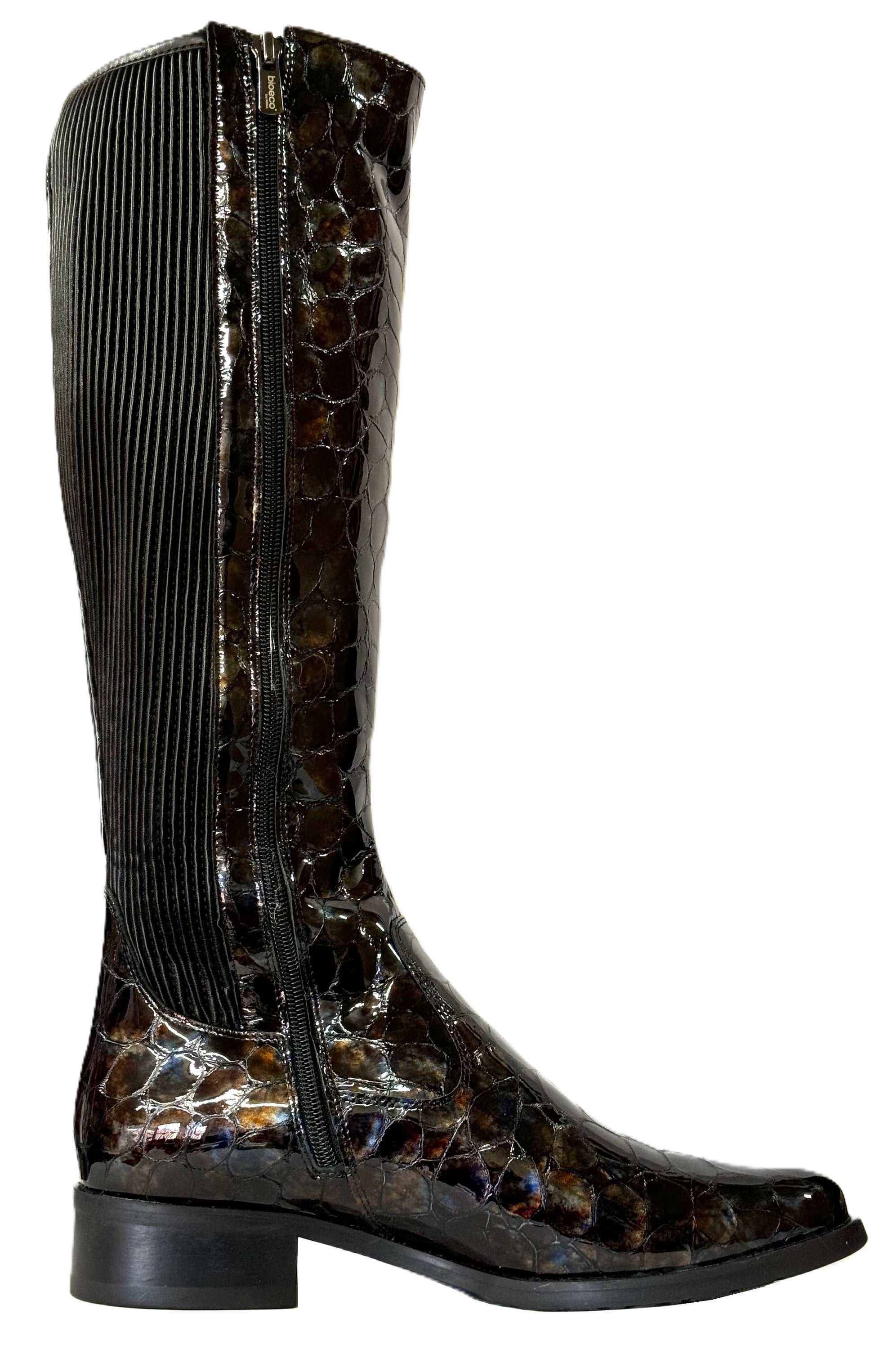 Bioeco Ladies Stretch Back Flat Heel Boot is a stunning long leg boot that combines style and comfort effortlessly. Featuring a croc-print leather upper in a glossy patent finish, these long leg boots are designed to provide all-day comfort while exuding sophistication. The long zip and elasticated back panel ensure easy on and off, perfect for those on-the-go days.