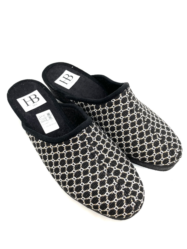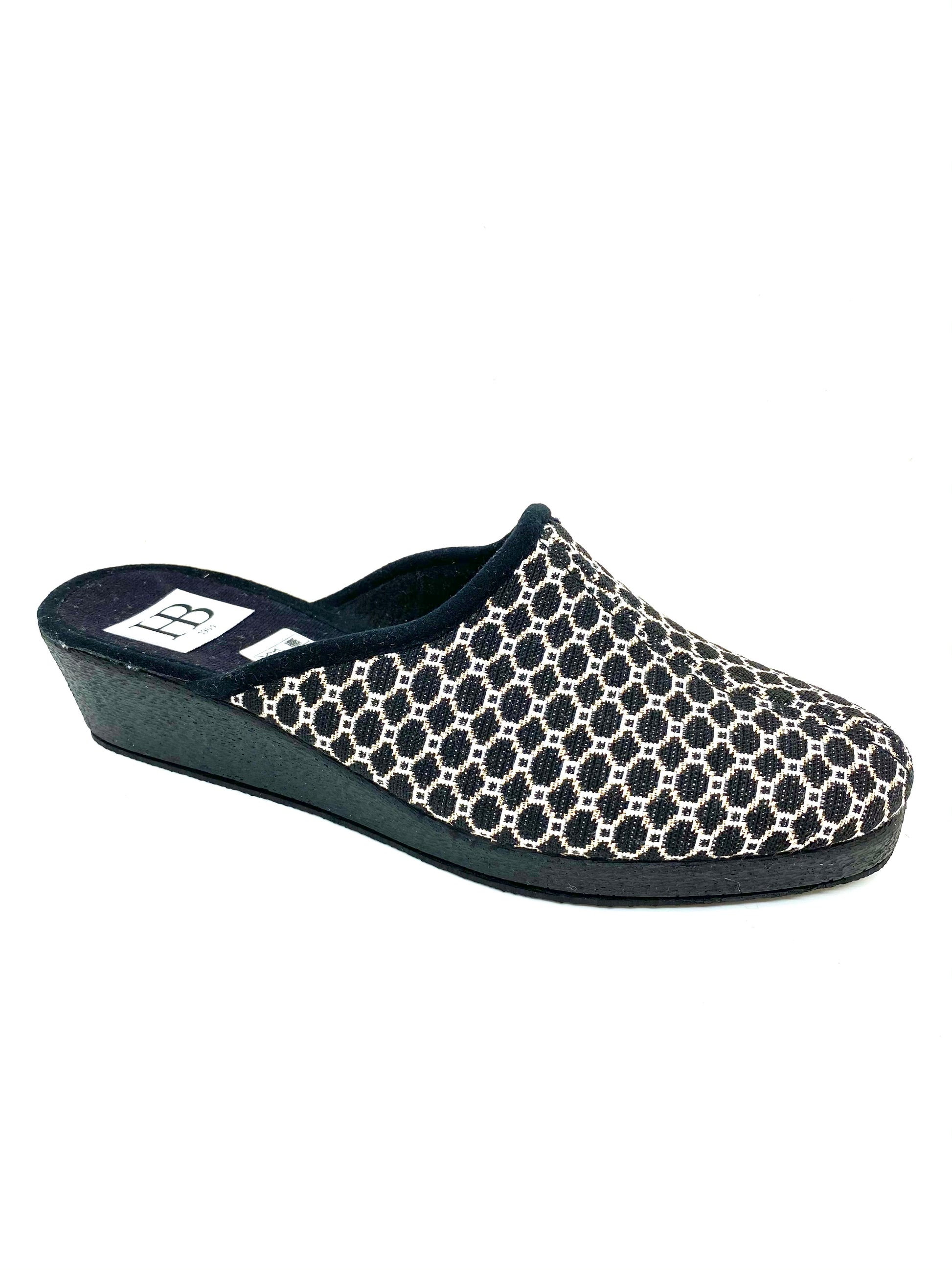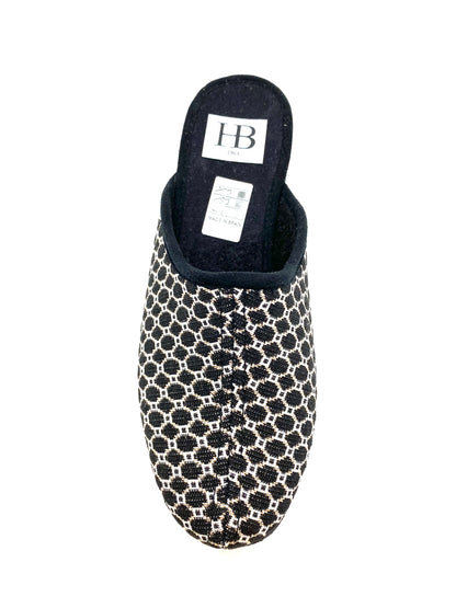 Keep your feet warm and cosy in these HB Henrietta mule style slipper. The black and gold uppers are textile with a luxuriously soft lining on a wedged rubber sole unit extra stability.