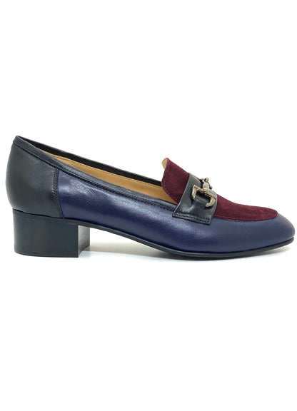 A smart heeled loafer in contrasting leather and suede. The metal snaffle across the front of the shoe adds an extra element of interest, while the low to mid-height heel ensures comfort all day. Full leather lining and light cushioning under foot.