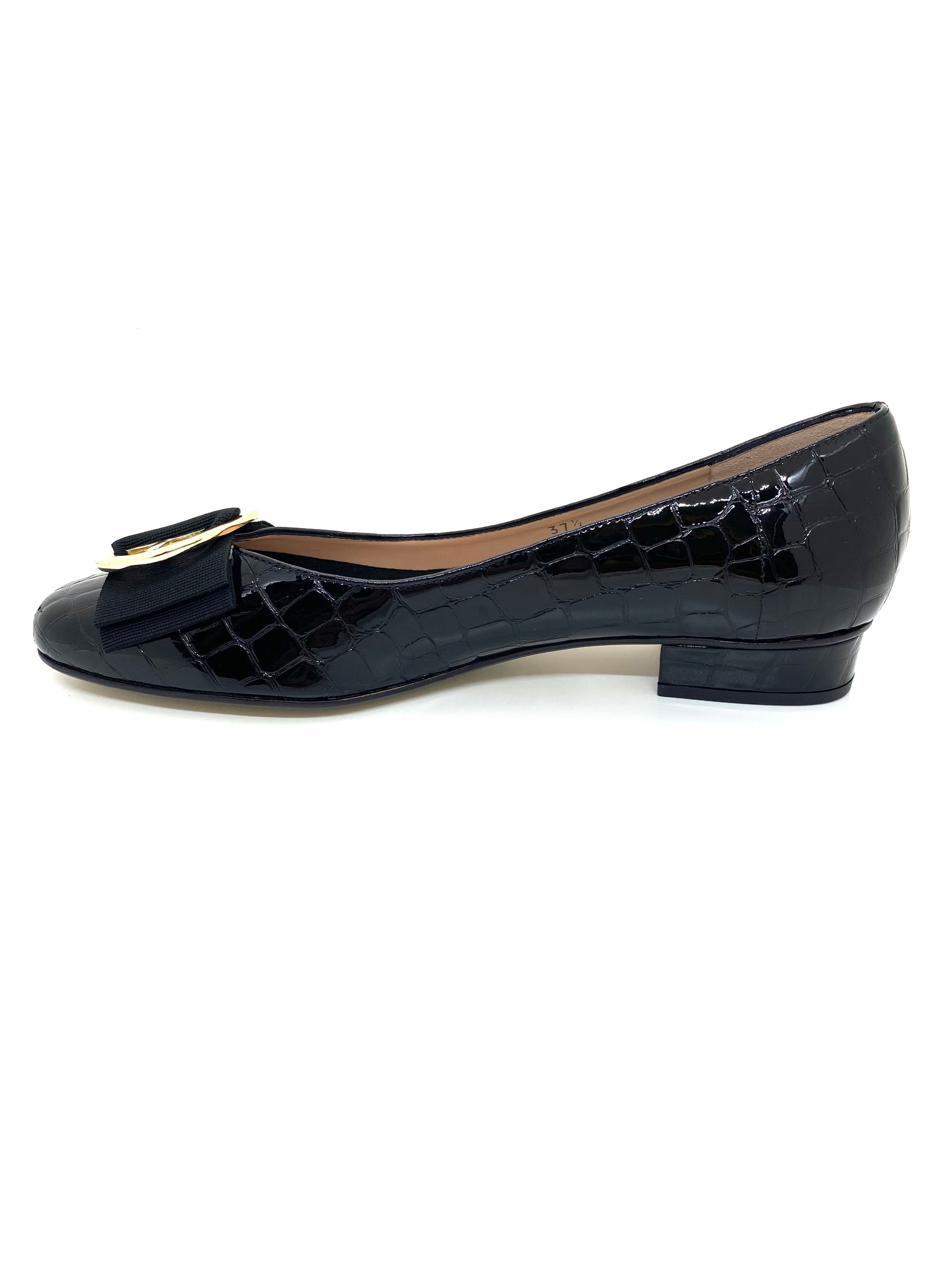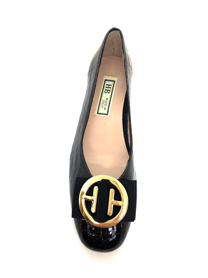Slip-on patent leather pump in a moc croc design with decorative bow and buckle detail to the front. June has a patent leather outer with cushioned leather insole for enhanced comfort. A timeless elegant style that can be dressed up or down. A signature pump from the HB Made in Italy range.