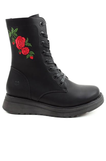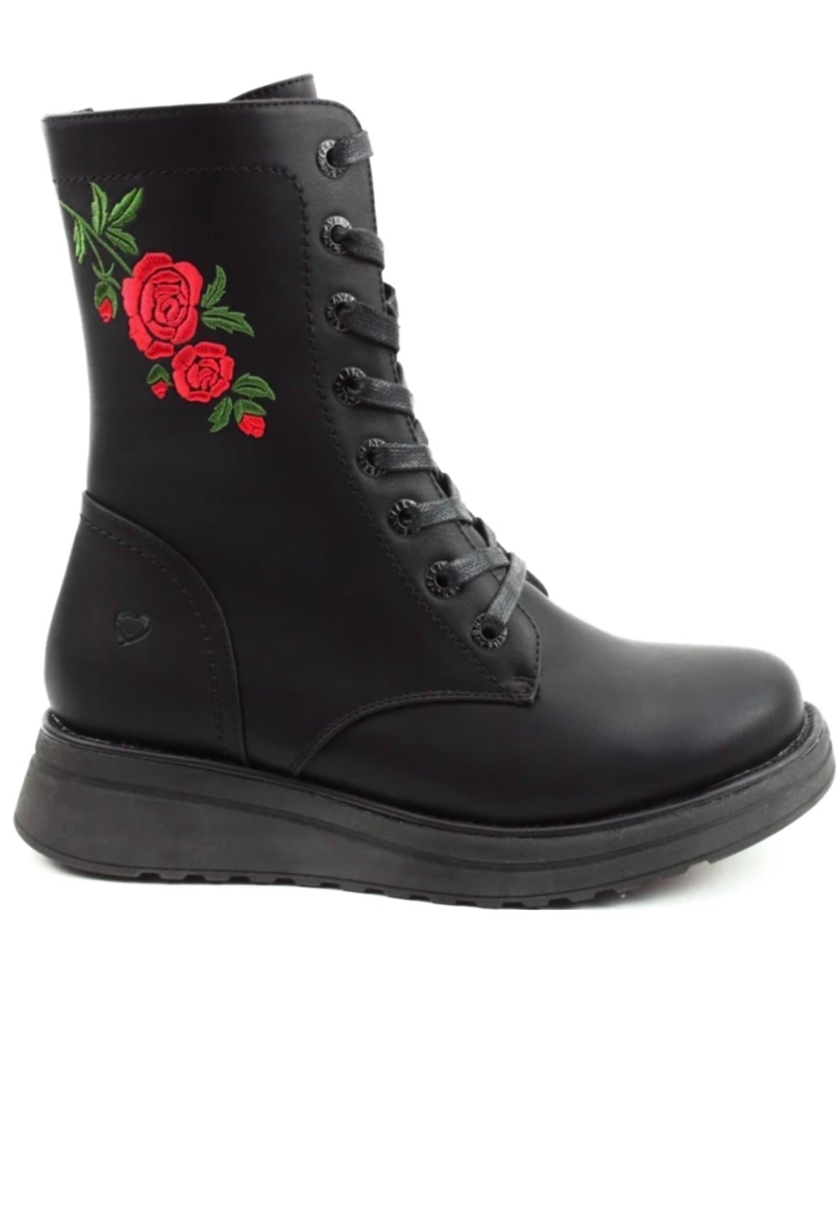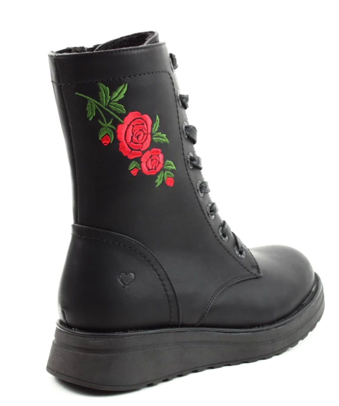Vegan friendly style Martina4 Rose features the renowned 3-heart outsole. With an easy-care man-made upper featuring a stylish embroidered rose motif, this style is perfect for all day, every day wear. The textile lining is complimented by our new removable textile covered Memory Foam insole. Stylish 8 eyelet lace-up design and finger pull tab plus a full length zip make for a great fitting and ultra-stylish boot.