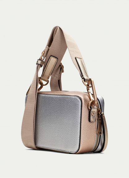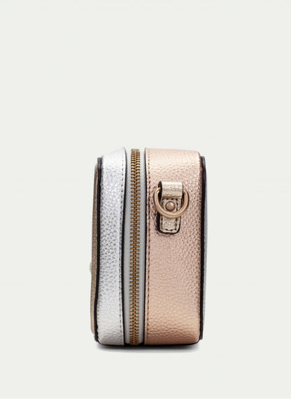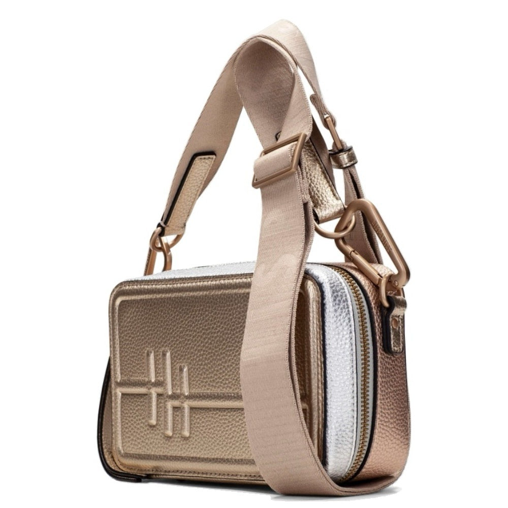 The Shoulder bag BV253979 in Gold / Silver is a compact and stylish accessory designed to elevate your wardrobe. The adjustable removable strap, featuring elegant gold metal hardware, ensures a comfortable and custom fit, With a gold zipper closure. The embossed logo on the front adds a touch of luxury and distinction. Whether dressing up for a formal event or adding flair to a casual outfit, this versatile bag complements a variety of looks.