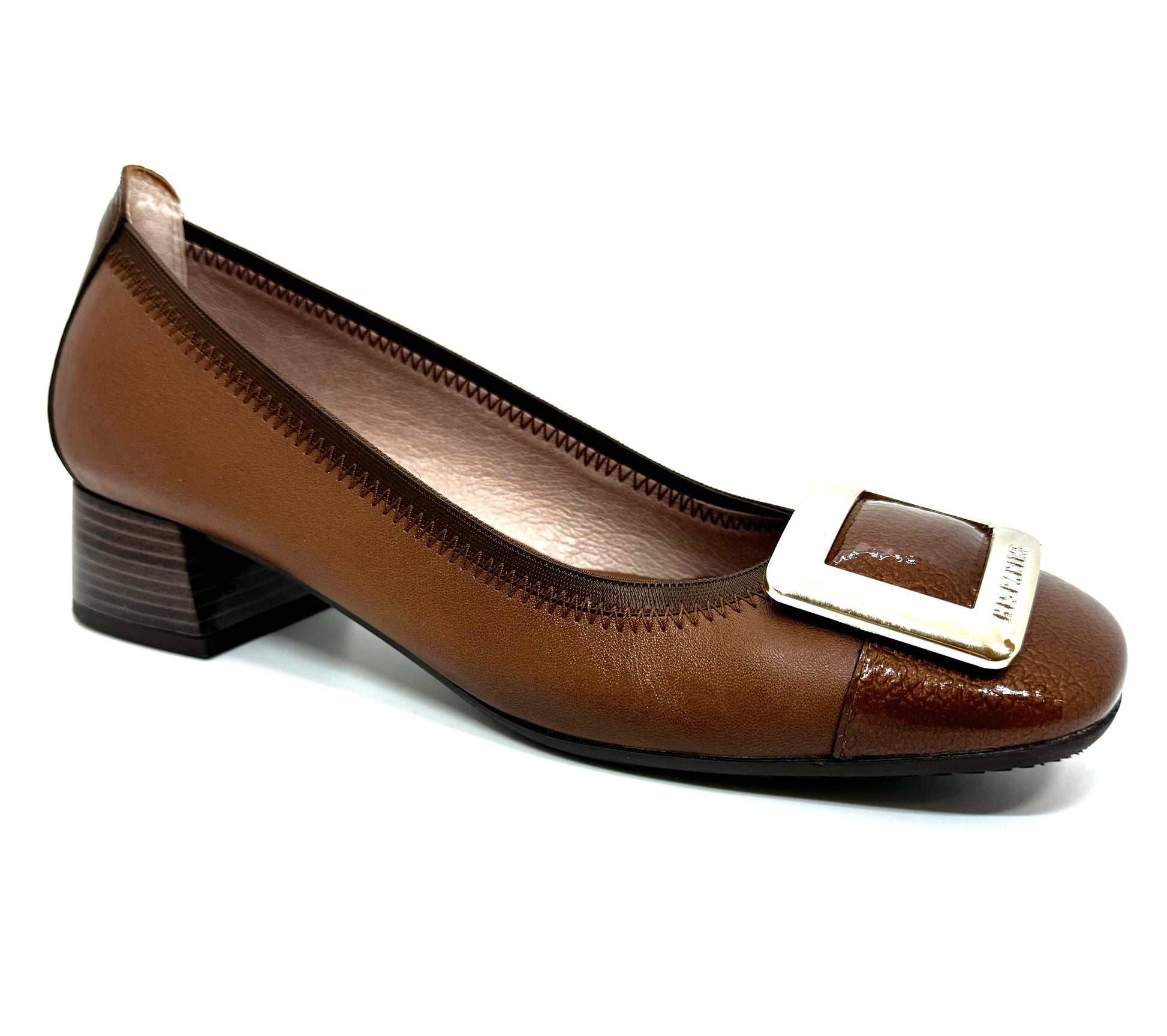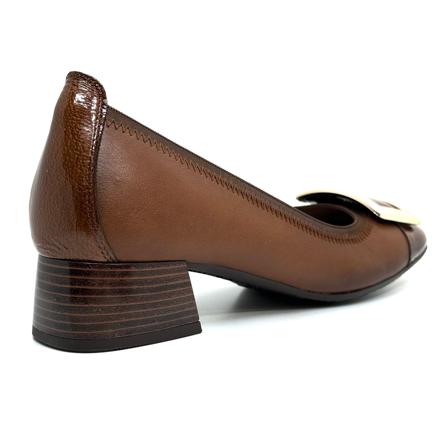 Leather ballerina with a 3 cm block heel. Stretch binding and maxi buckle trimming on the toecap. This shoe incorporates the Triflow technology, which cushions each step providing flexibility and comfort on the tread, thanks to its triple cushioning.