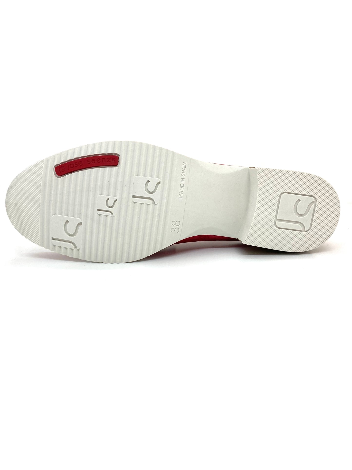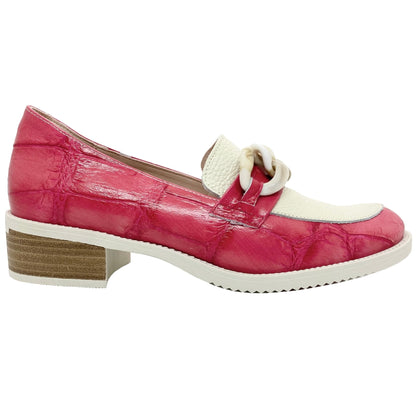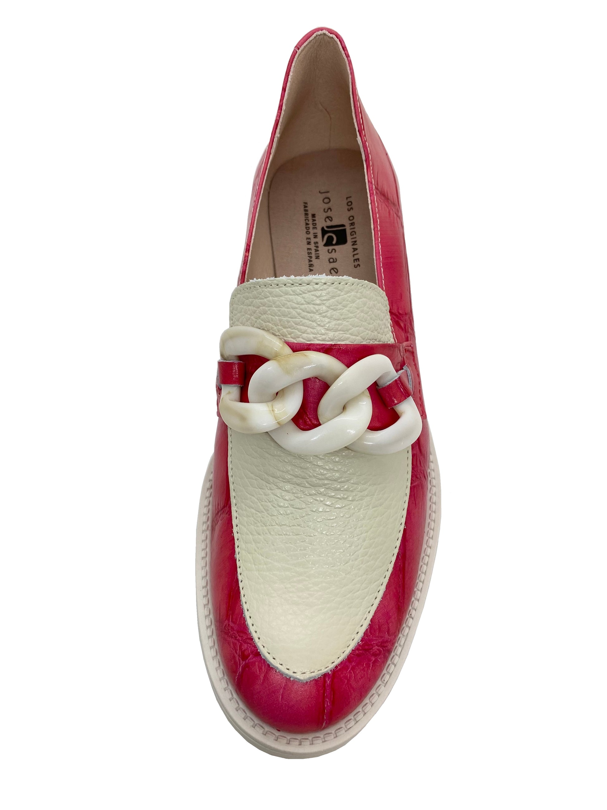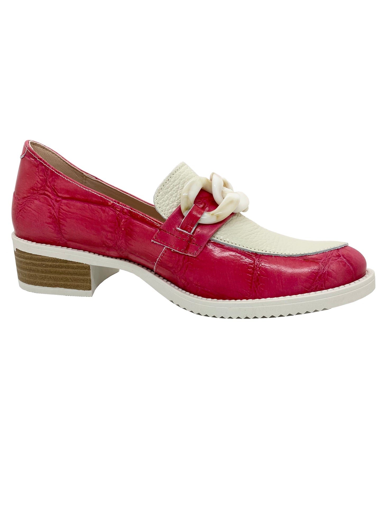A stylish modern loafer on a low block heel. Destiny in denim blue has a contrasting white vamp and chunky white chain snaffle across the front. A great addition to your spring/summer wardrobe. Lovingly handmade in Spain.