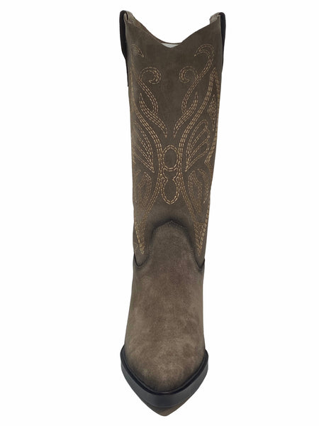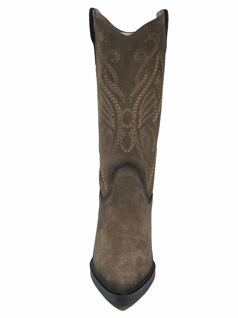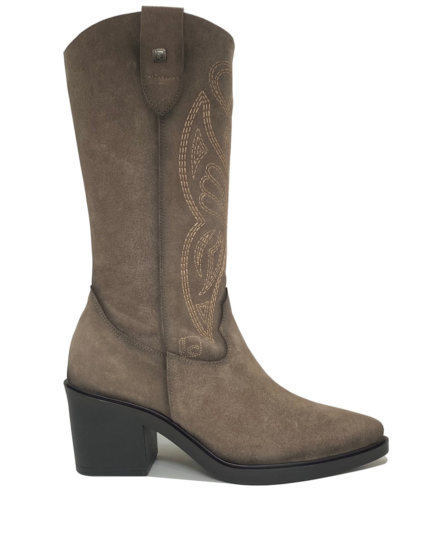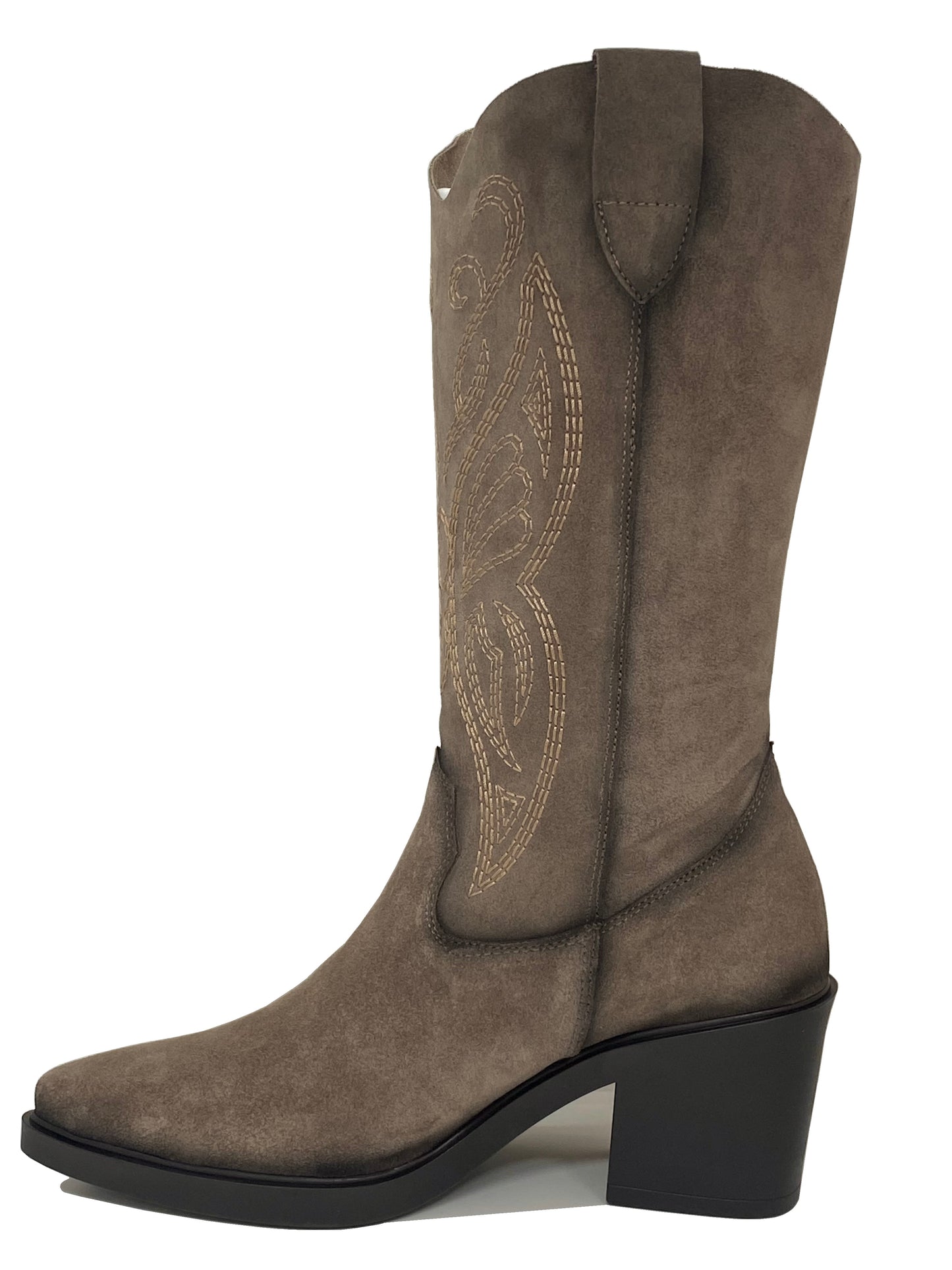 These stylish cowboy boots are right on trend this season. Unlined suede with an attractive butterfly design stitched on the front of the boot. A mid height block heel gives extra height with stability. A versatile boot that looks just as good with a dress as they do with jeans or leggings.