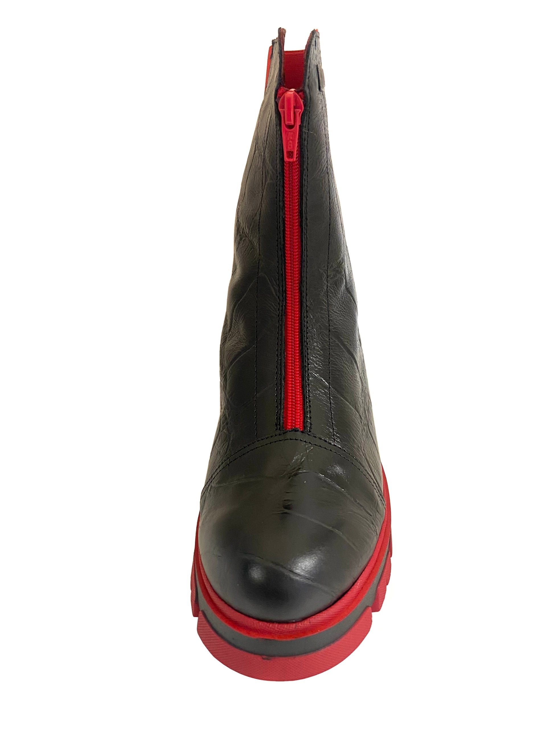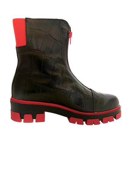 Moc crocodile print leather biker boots with striking red contrast elements. The chunky red and black sole is lightweight. There is a red elasticated panel at the back of the boot above the ankle. There is a zip down the front of the boot for easy foot access.