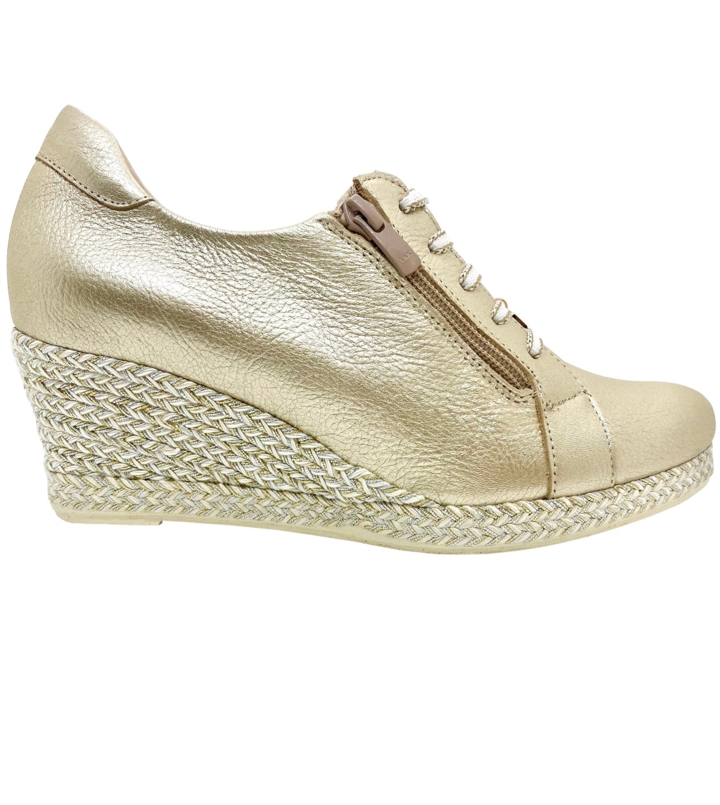 Wedge heeled shoes in metallic leather with a moc espadrille heel. These lace-up shoes allow you to achieve the perfect fit, but with the convenience of a zip fastening. The wedge heel has silver and gold running through the thread. Light cushioning underfoot for comfort.