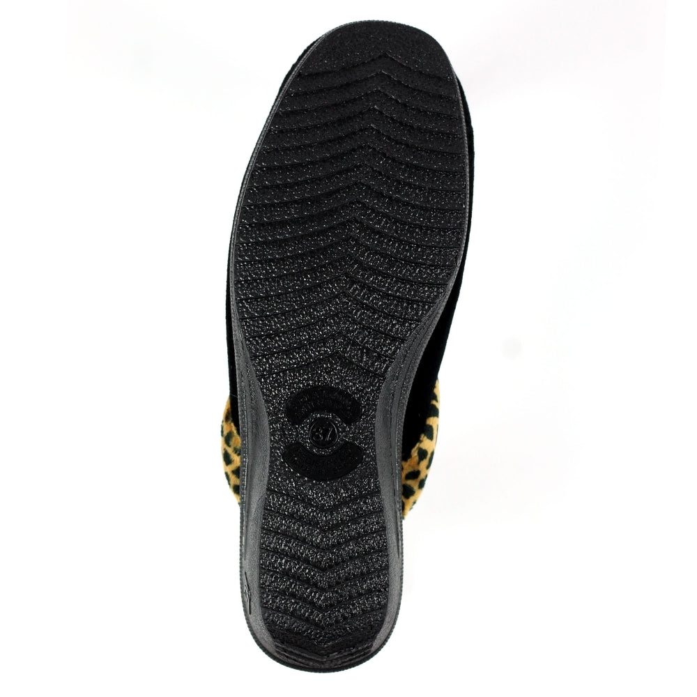 A gorgeous, super soft velour slipper from Lunar. The black upper is beautifully contrasted by a leopard print trim which gives the slipper a glamorous look. The mid wedge heel, padded footbed and mule design make the slipper comfortable to wear, easy to put on and suitable for all year round wear.