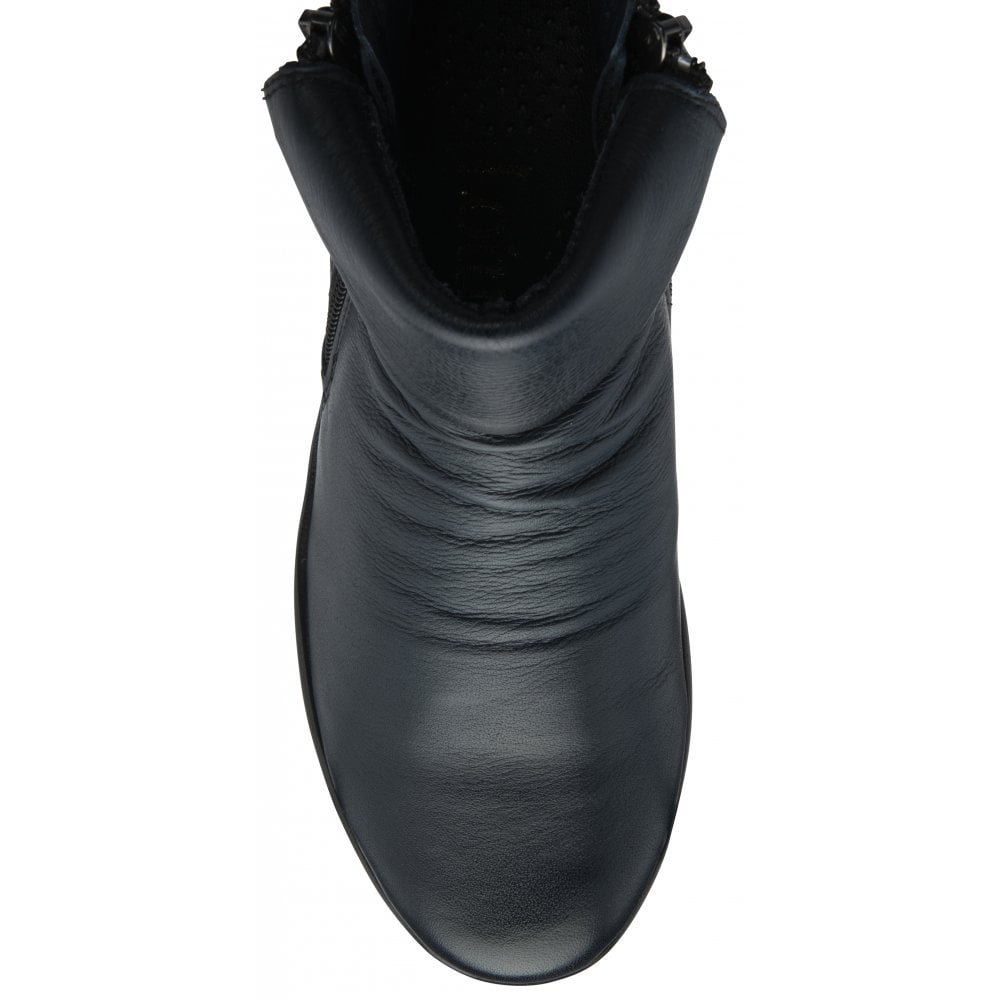 Exceptionally comfortable and a true delight to wear is the Lotus Cordelia ankle boot. This understated navy boot is constructed from premium leather with subtle ruche detailing on the upper. As well as incorporating an exposed side zip and a turn down collar, this women’s navy leather ankle boot rests on a 4.5cm wedge heel. The Lotus Cordelia boot really is the perfect accompaniment to casual looks.