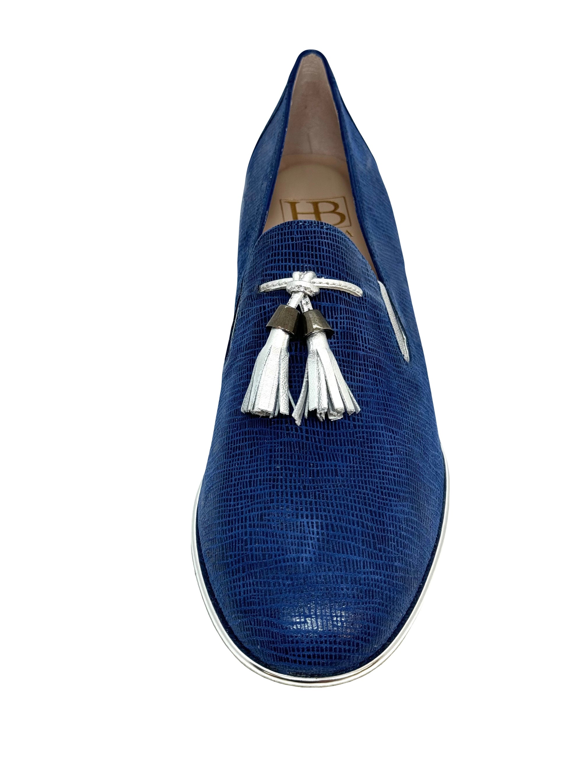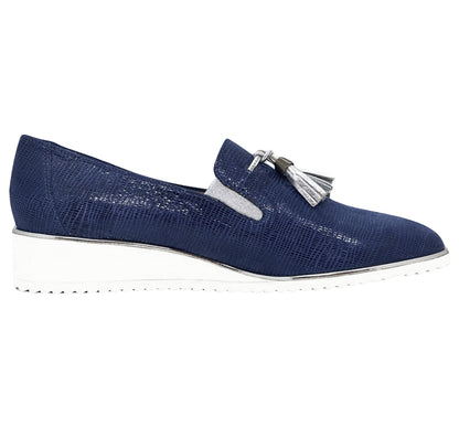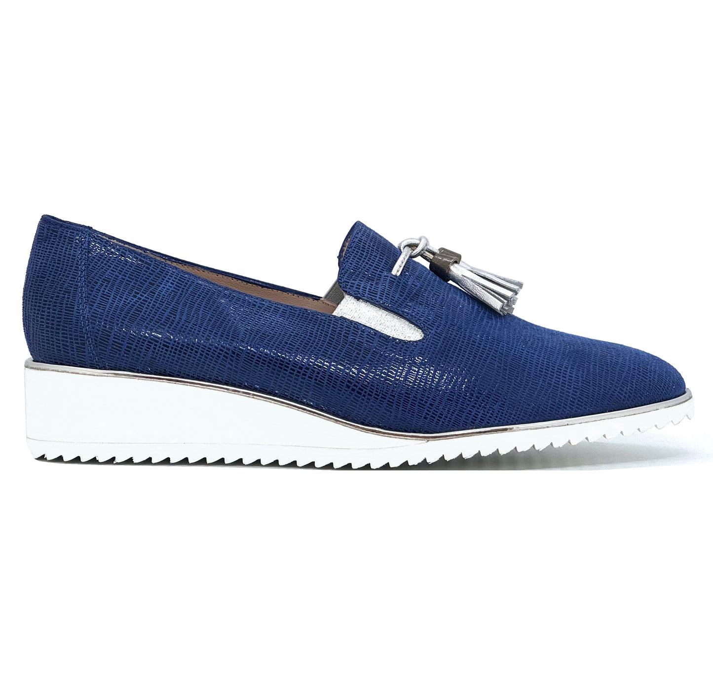 Finely crafted low wedge elegant shoes, in blue leather print with silver tassle detail, finished with silver elasticated gussets for added extra fit and comfort, great for both daytime to evening wear.
