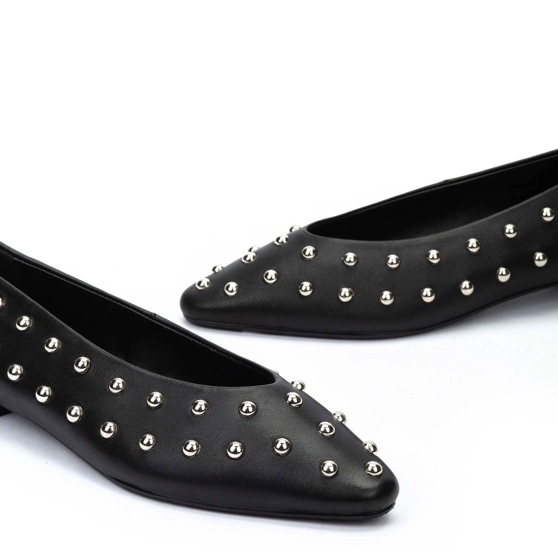 Vescia ballerina. Leather ballerina with studs and a 2.3 cm metallic heel; almond toe. Elevate everyday with New Elegance, updated sophistication and comfort.