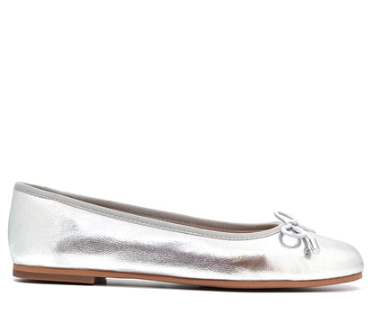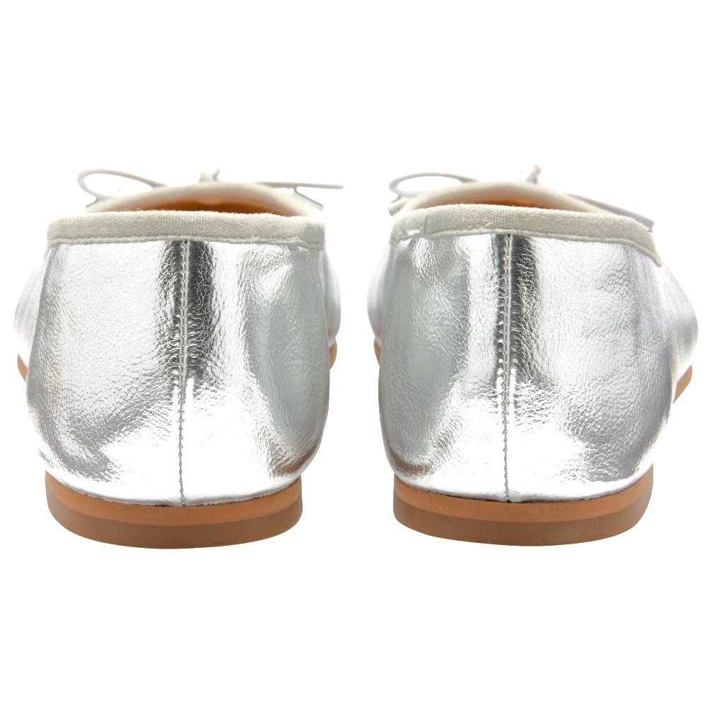 Meet the ultimate wardrobe staple: Ravel's Ellon silver ballerina pumps. These elegant flats showcase charming bow detailing on the vamp and a classic round toe, making them a sophisticated yet versatile choice for any outfit. Their understated chicness makes them perfect for adding a touch of grace to your daily ensemble. Whether you're navigating a busy day at the office or running weekend errands, these Ravel Ellon ballerinas effortlessly blend comfort with style. For a polished office look, pair them with a tailored skirt and blouse, or dress them down with straight jeans and a cosy knit for a chic, relaxed weekend vibe.