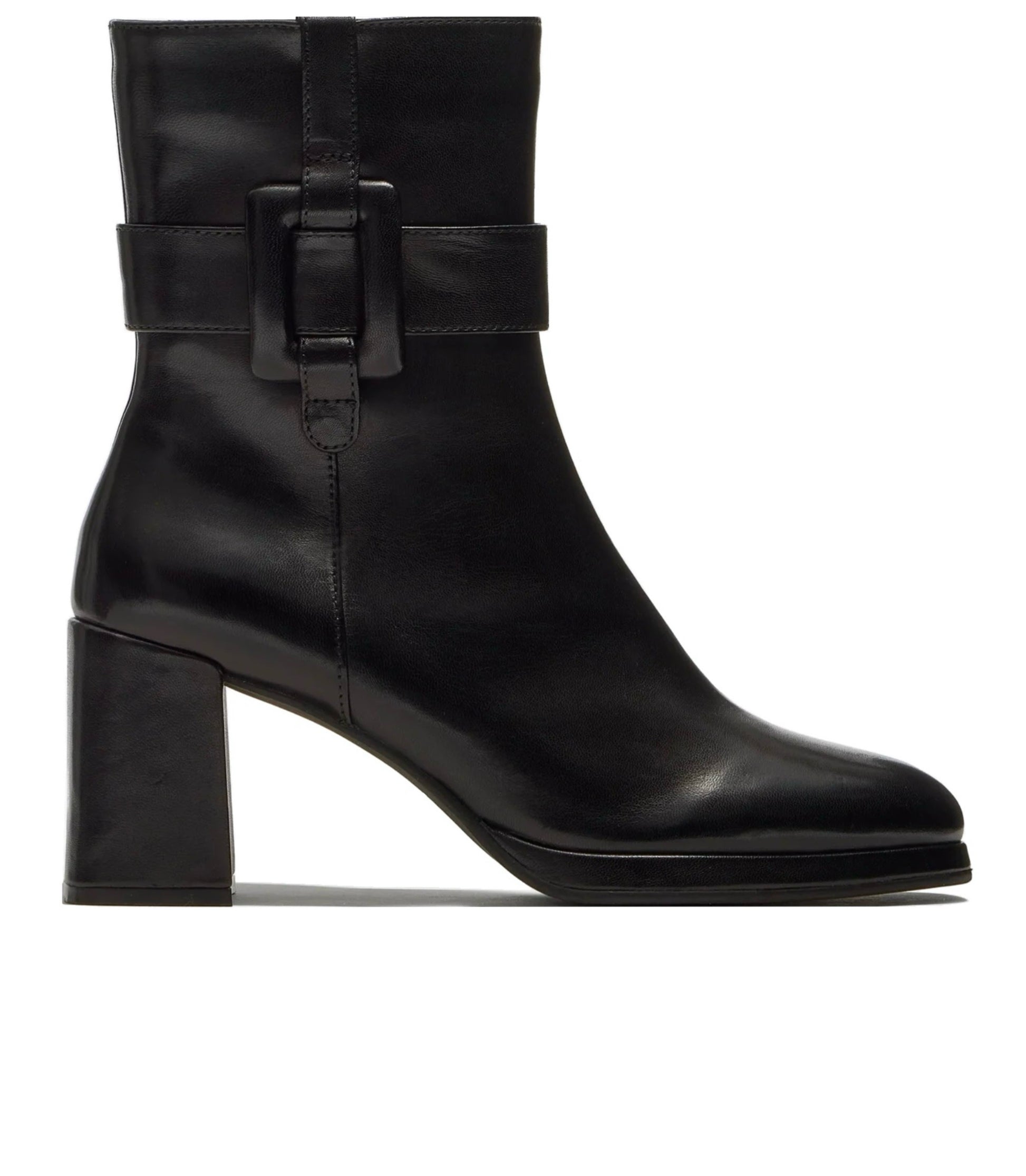 The Analisa is a minimalist ankle bootie in Black Delice leather with a 65 mm heel and a plateau for comfort. It features a square toe cap with accentuated stitching and a leather covered buckle.