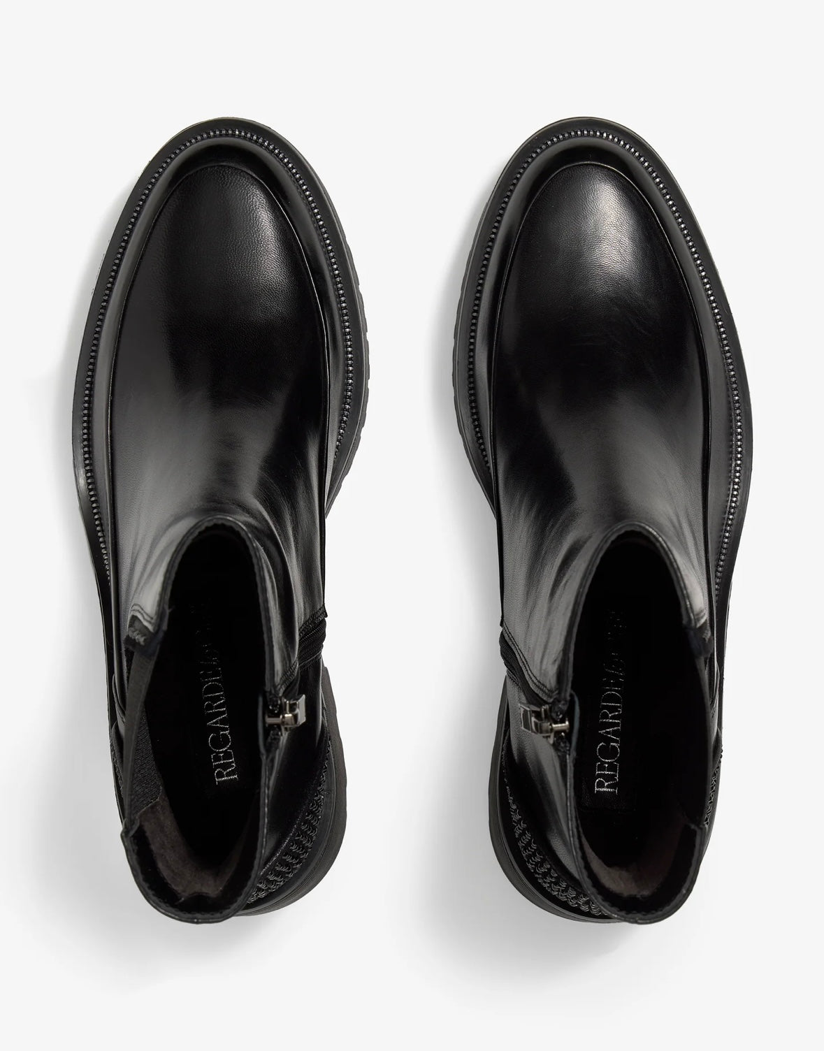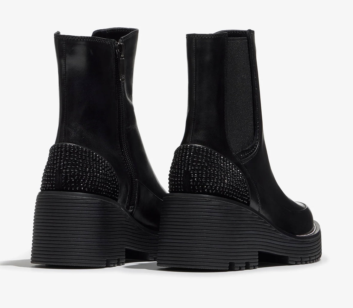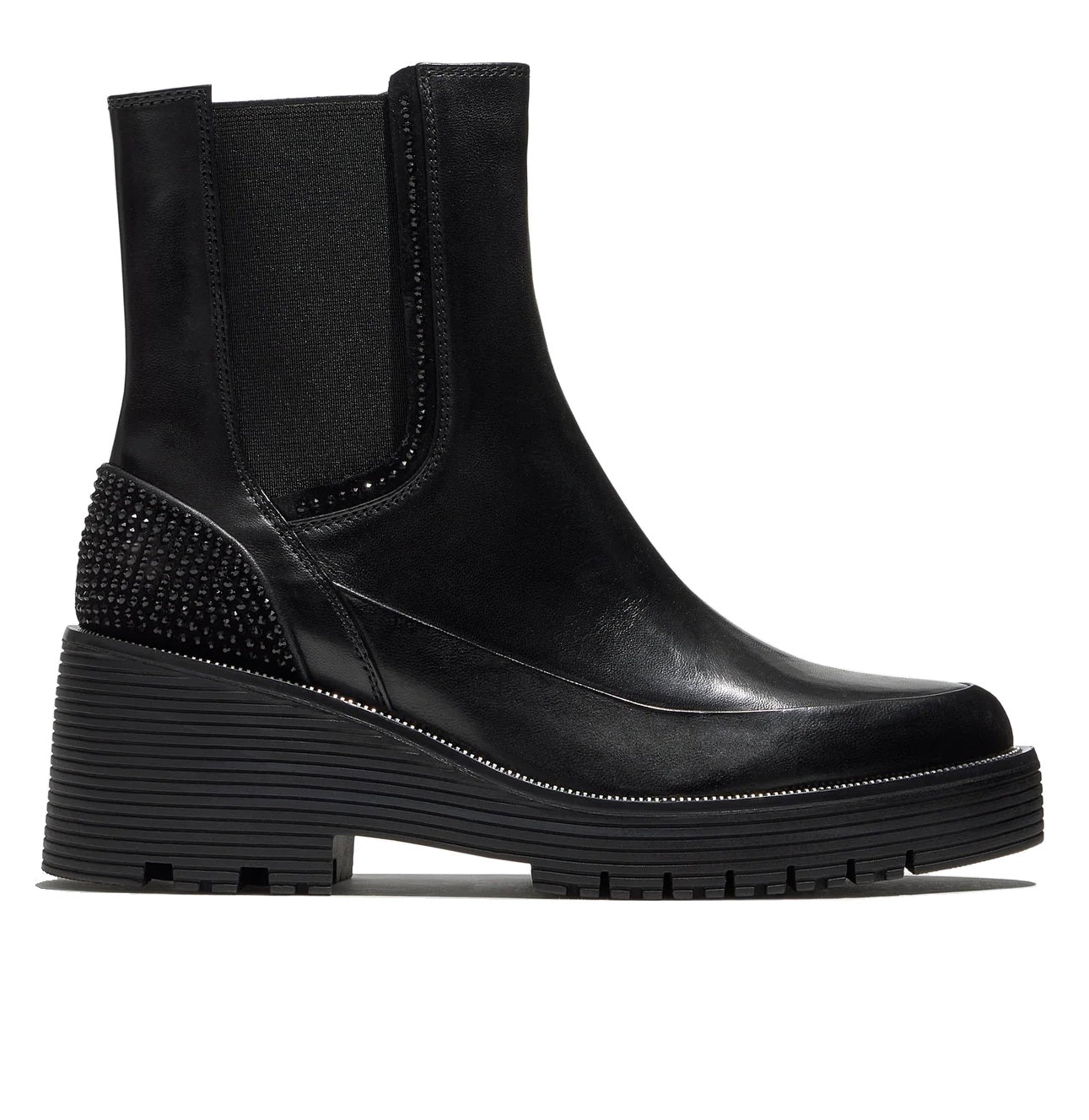 The Sadhy biker boot in Black Delice leather feature a 63 mm plateau, velvet lining with short hair fur, and versatile fastening with an interior zipper and elastic side panel. Metal welt and stone details, along with accentuated stitching, enhance their refined look.
