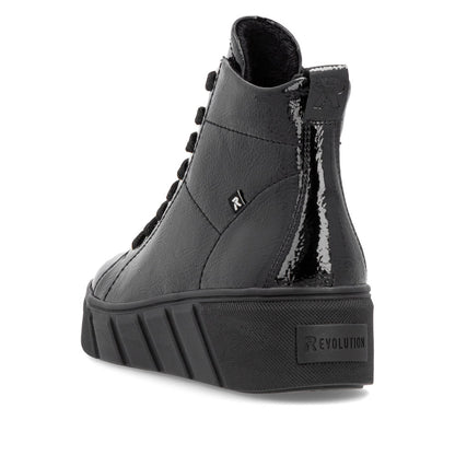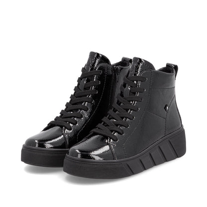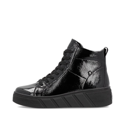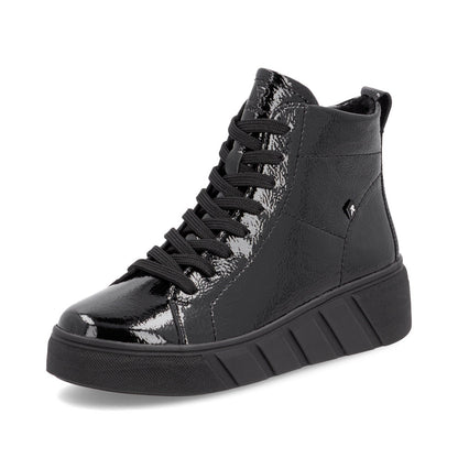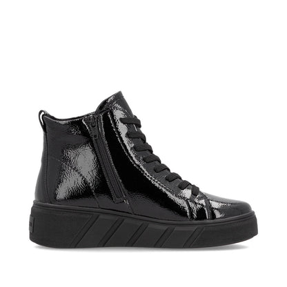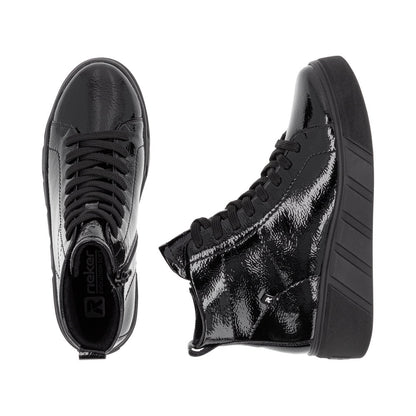 Black Rieker High sneakers for women made of high-quality patent leather. Top combination of zipper and lacing for quick, easy entry and exit. LightPU outsole with ultra-light, cushioning properties. Padded, cushioning and removable insole.