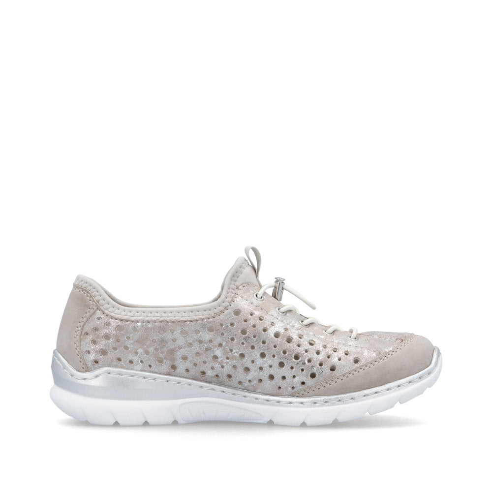 The Rieker Women's L32P6-90 Ice/Rose Metallic Trainers combine practicality with a modern design. The upper, made from a blend of textile and synthetic materials, features a subtle metallic finish in ice and rose tones, adding a touch of sophistication to everyday wear. The lightweight textile lining ensures breathability, while the Rieker anti-stress insole provides superior comfort and shock absorption throughout the day.