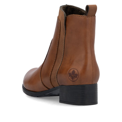 These Rieker brown leather ankle boots with small block heel offers a comfortable lift, while the stitch detailing adds a classic touch. Stud accents provide a modern, stylish edge. The zip fastening ensures easy wear and a secure fit, making these boots a versatile choice for both everyday and dressier occasions.