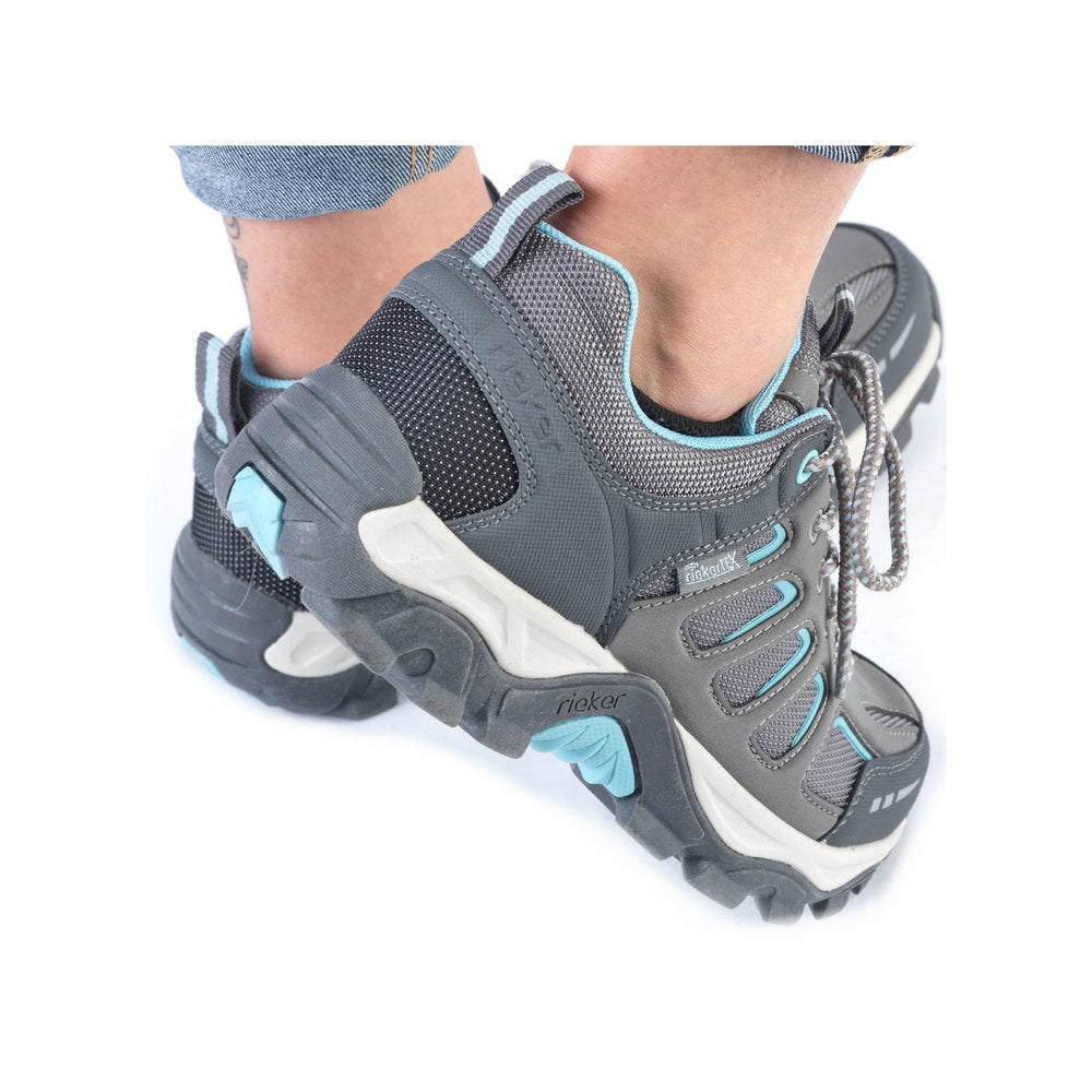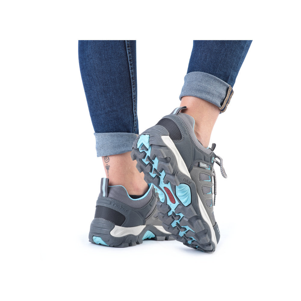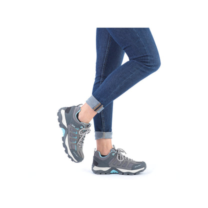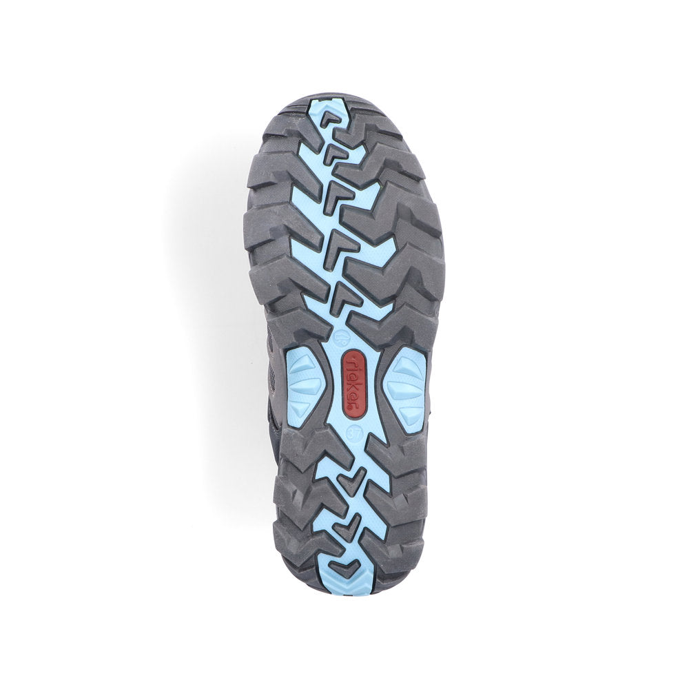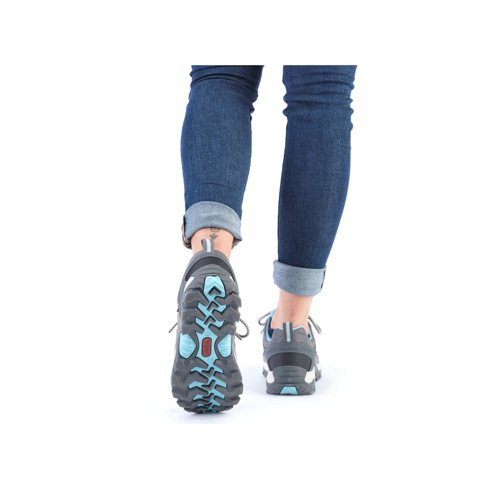 The grey upper, a material and structure mix of imitation leather and textile with light blue accents fits perfectly with the design of the profile outsole. The lace-up shoe is optimally padded in the most important places and you can adjust the width with the lacing strap. Two pull loops help you put it on beforehand. The synthetic interior consists of a soft lining and the ever-popular MemoSoft insole with the soothing memory effect. Another invisible highlight is the water-repellent RiekerTex membrane, which allows you to jump into a puddle and forget the seriousness of life.