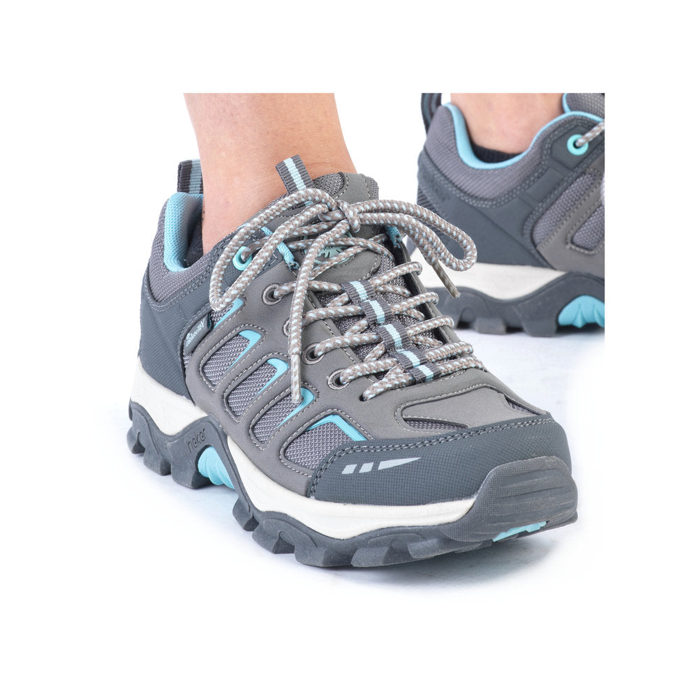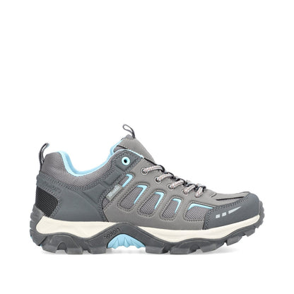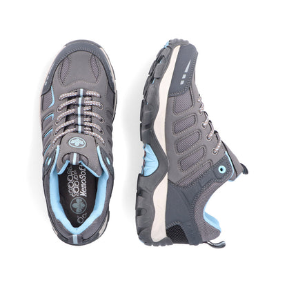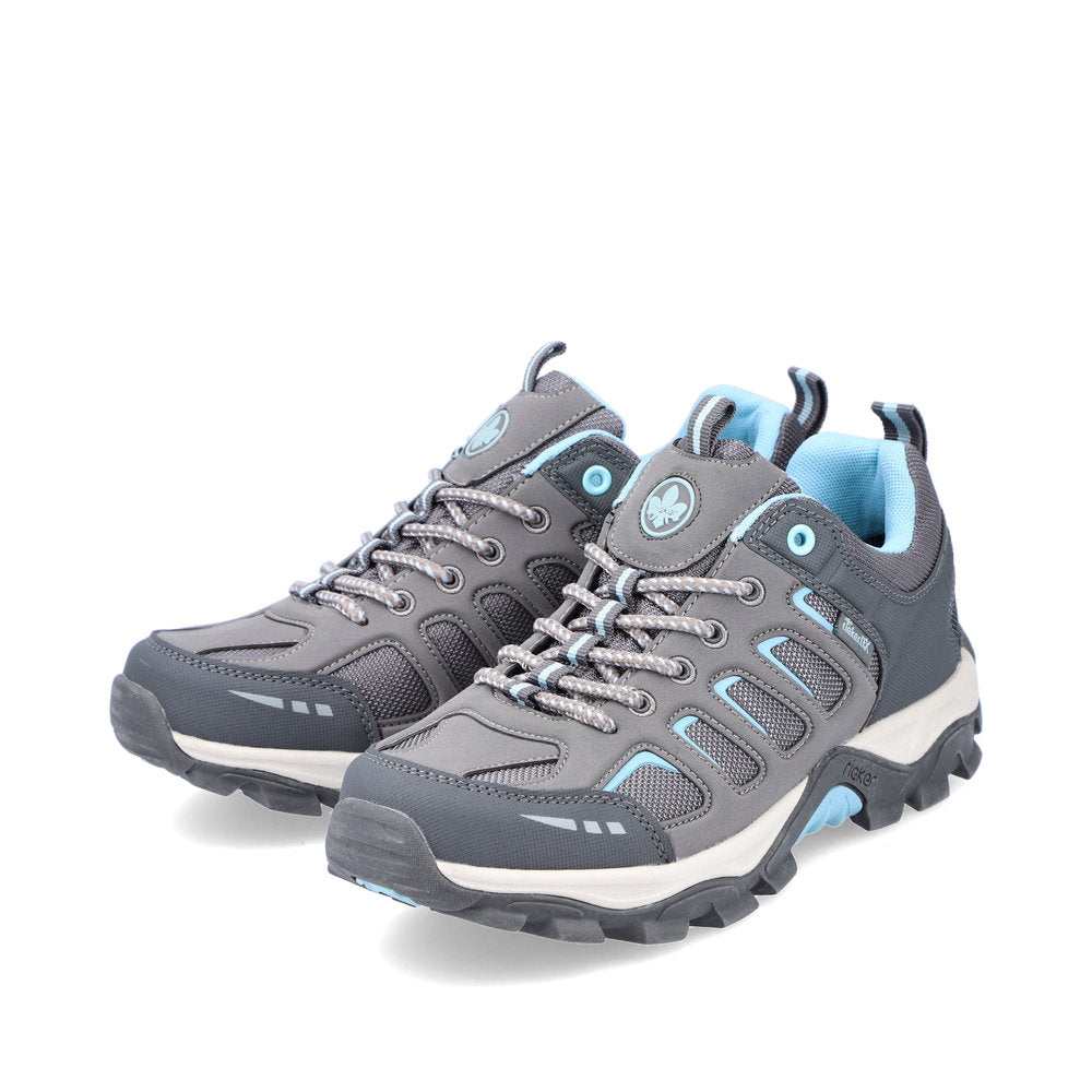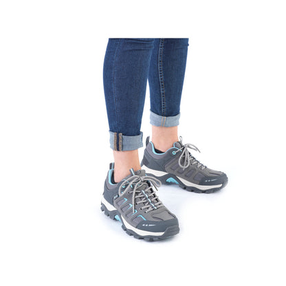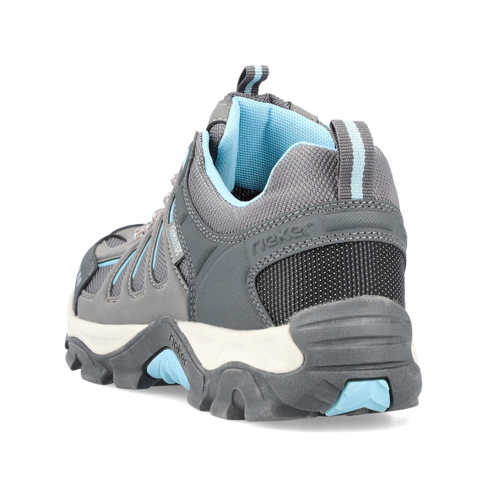 The grey upper, a material and structure mix of imitation leather and textile with light blue accents fits perfectly with the design of the profile outsole. The lace-up shoe is optimally padded in the most important places and you can adjust the width with the lacing strap. Two pull loops help you put it on beforehand. The synthetic interior consists of a soft lining and the ever-popular MemoSoft insole with the soothing memory effect. Another invisible highlight is the water-repellent RiekerTex membrane, which allows you to jump into a puddle and forget the seriousness of life.