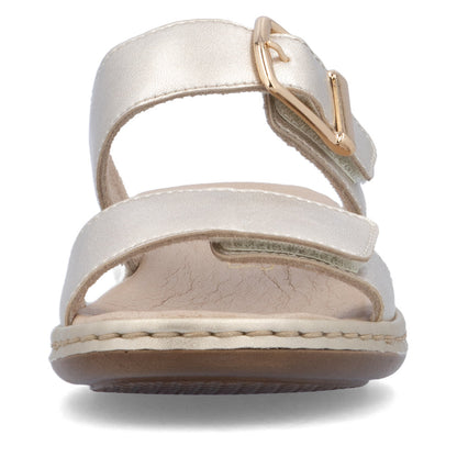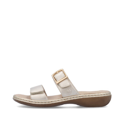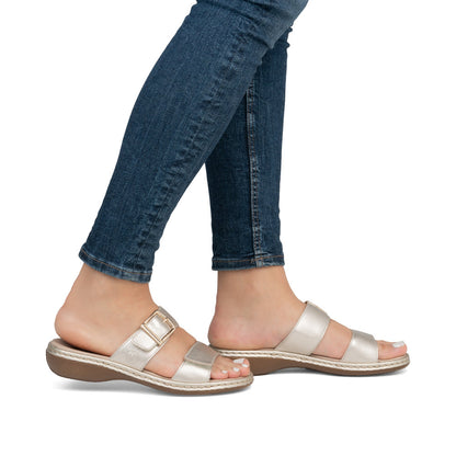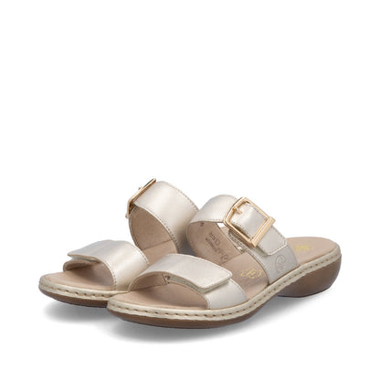 These golden Rieker mules made of smooth leather are perfect for every day. The stitchdown construction makes this shoe a particularly durable and flexible companion. The double hook and loop fastener allows for a quick entry and keeps the shoe perfectly on the foot. The trendy buckle is a real eye-catcher. The shock-absorbing and light sole with wedge heel ensures a pleasant, cushioned feeling at every step. The slim fit E 1/2 provides additional support.