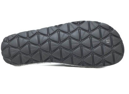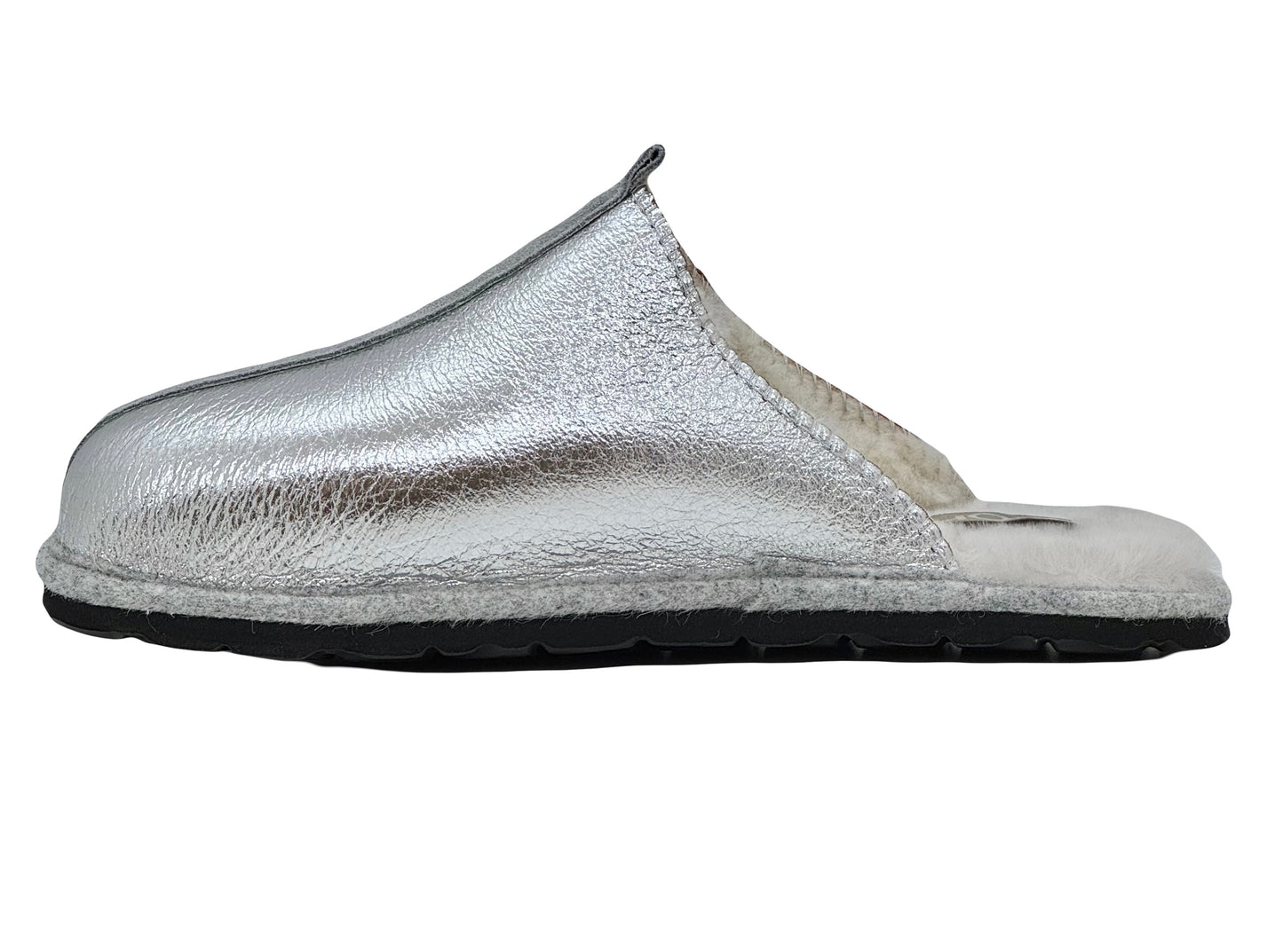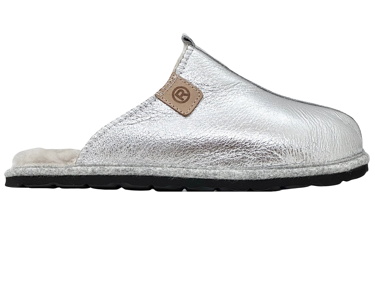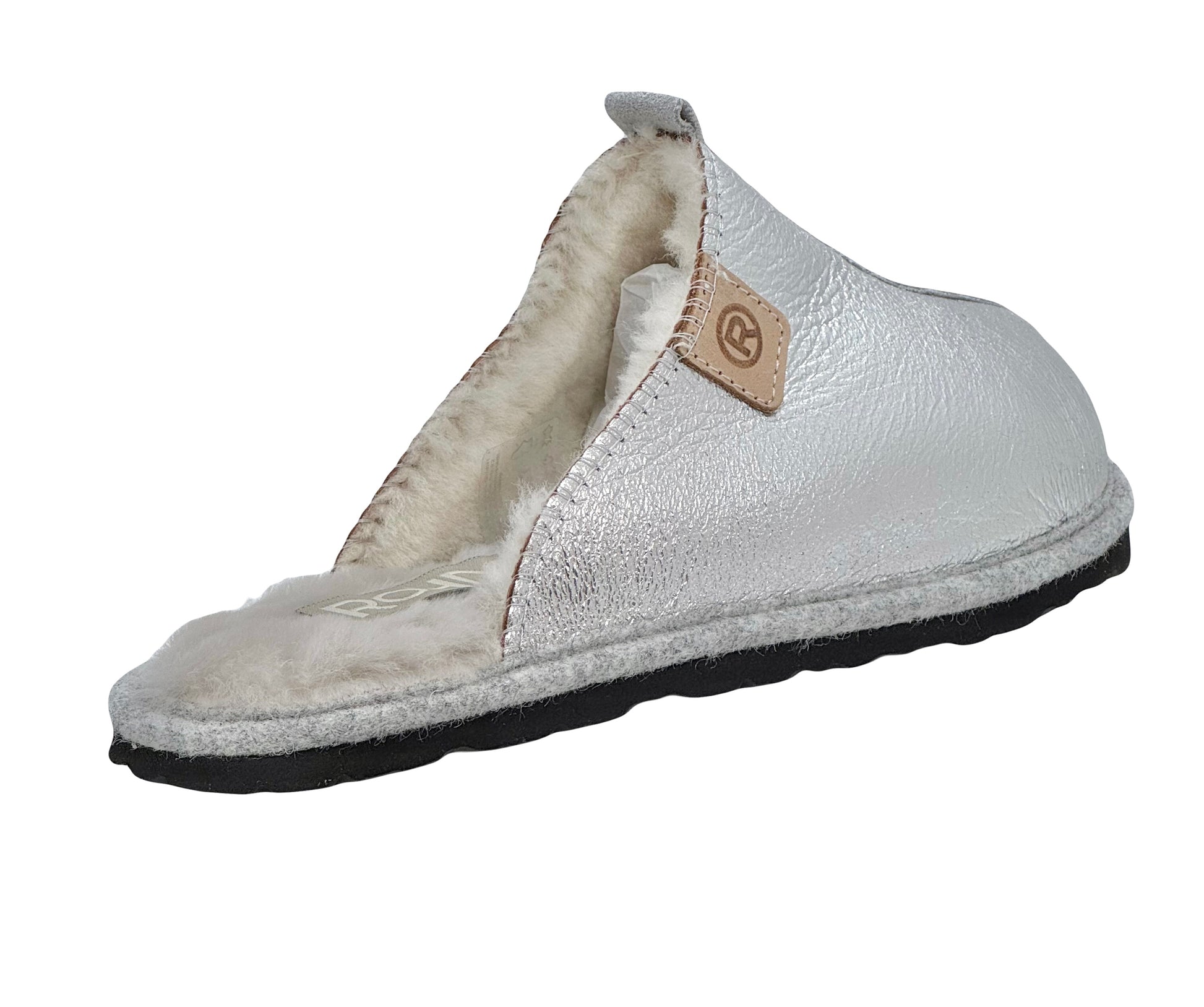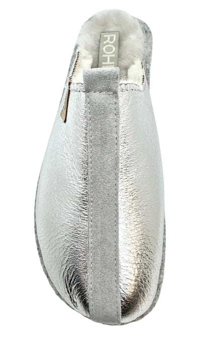 The Rohde 7057 Silver Slipper is a stylish and comfortable choice for the colder months. This high-closing entry-level model in shiny crack metal silver with a contrasting beige suede piping exudes luxury. The soft sheepskin lining ensures wonderfully warm feet and a comfortable step-in feeling. The lightweight, wear-resistant outsole offers long-lasting walking comfort and makes this sandal suitable for both indoor and outdoor use. The felt edge finish around the sole adds an elegant finishing touch.