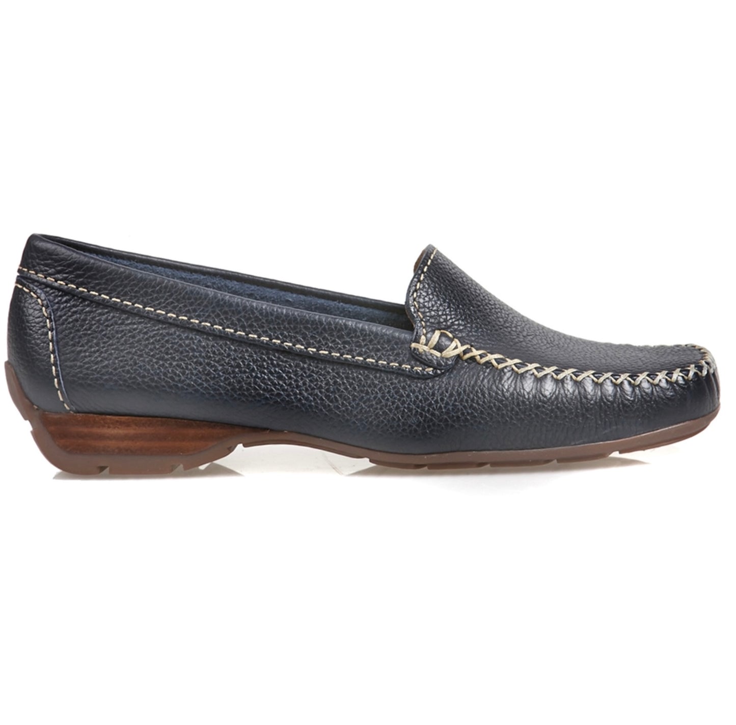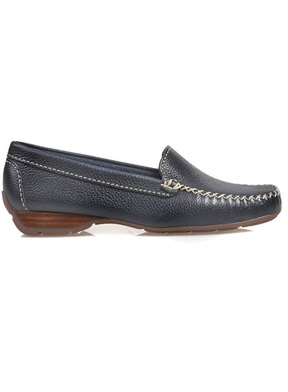 A traditional moccasin loafer shoe from Van Dal, with a full grain leather upper and small heel. This classic style slip on shoe has traditional stitching on the toe for a relaxed and casual look. The Sanson also benefits from Van Dal's Underfoot Comfort System, making it a very comfortable everyday shoe.