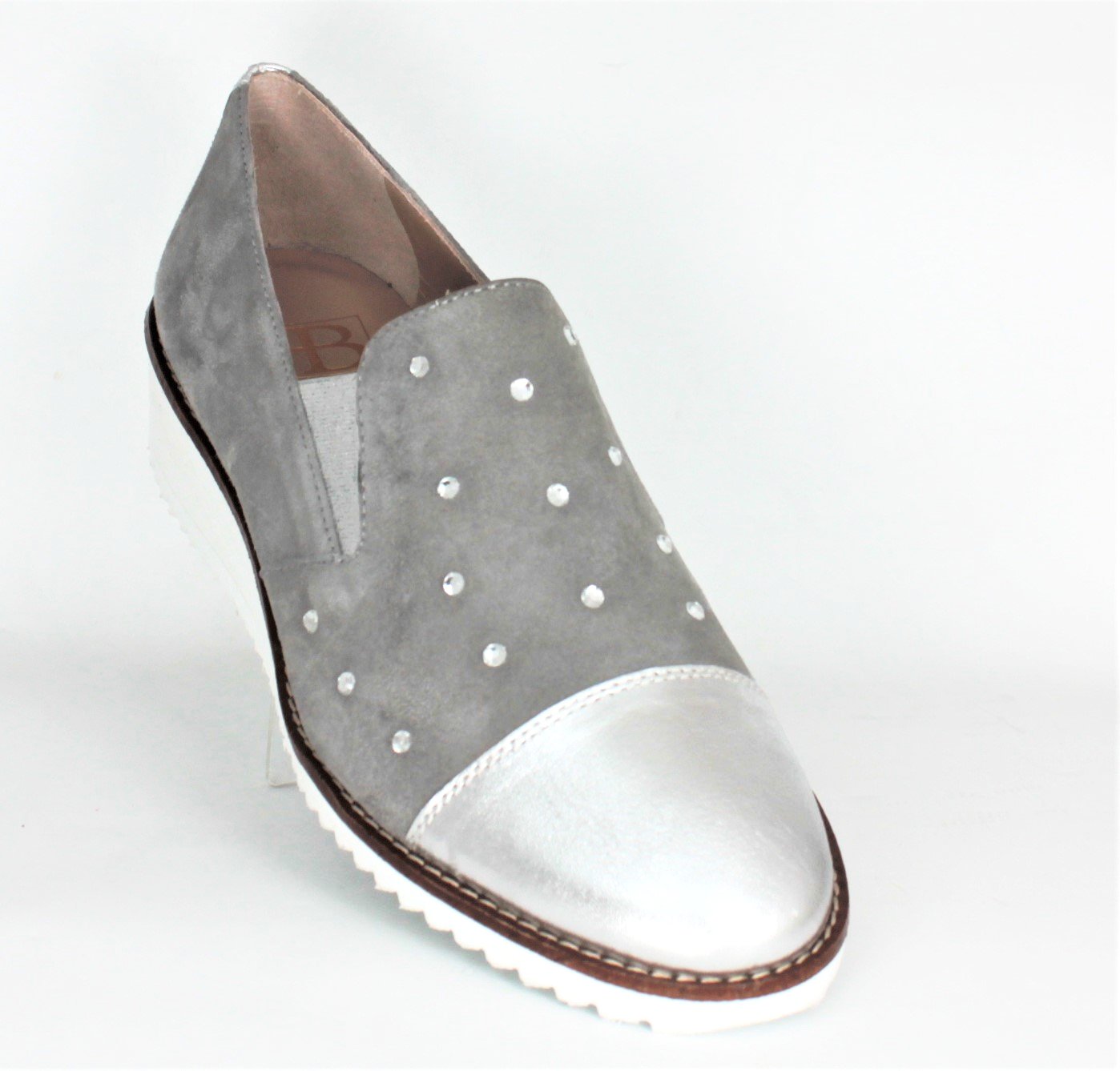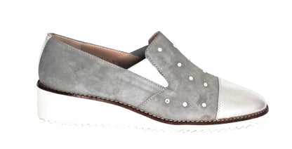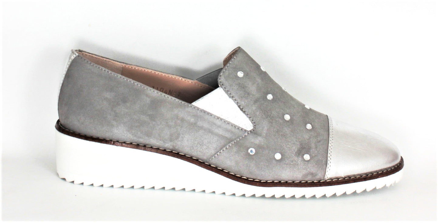 From HB Shoes Espana range these fabulous loafers in soft grey suede and silver toe and heel. They have pretty diamante and silver elastic to finish them off and for ease of wear, on a 40 mm white wedge sole.