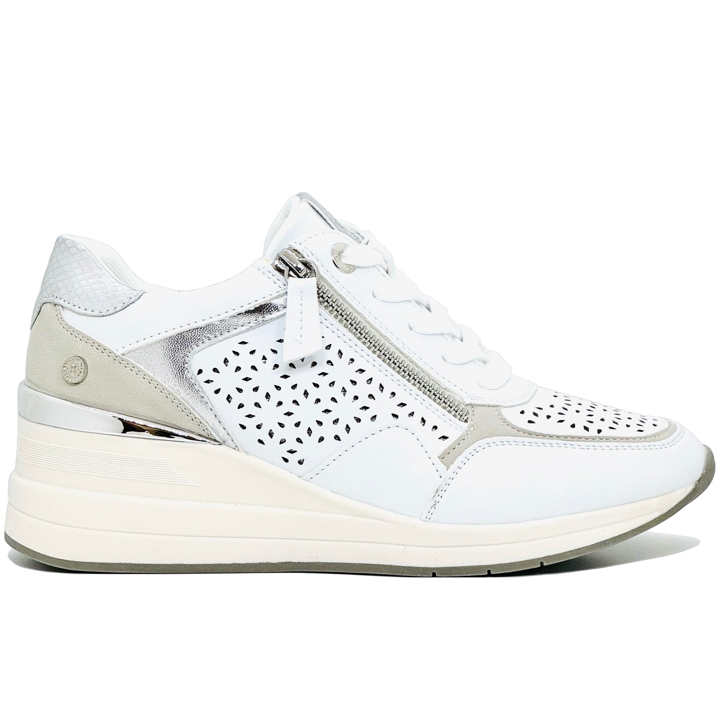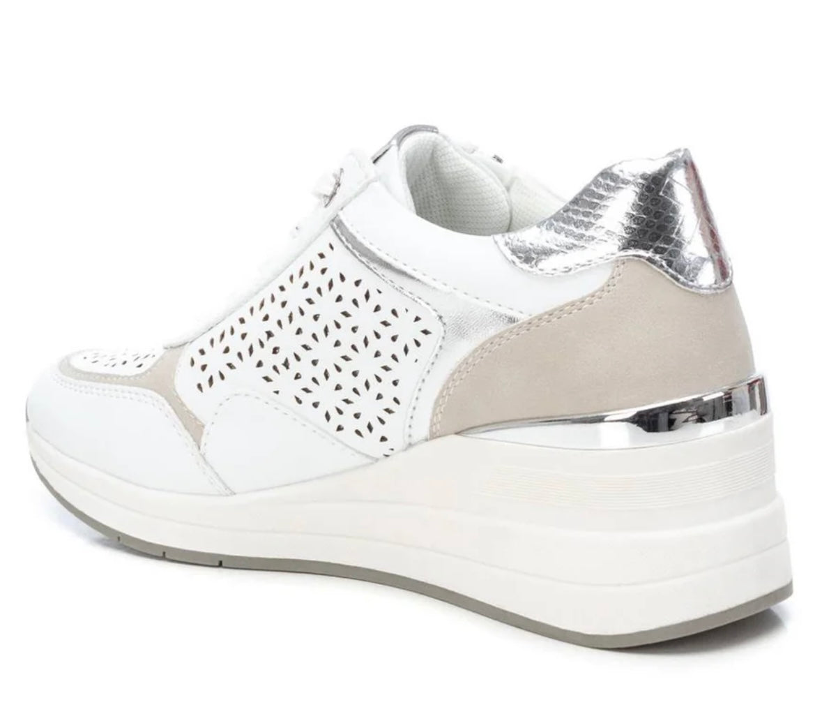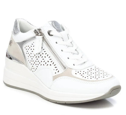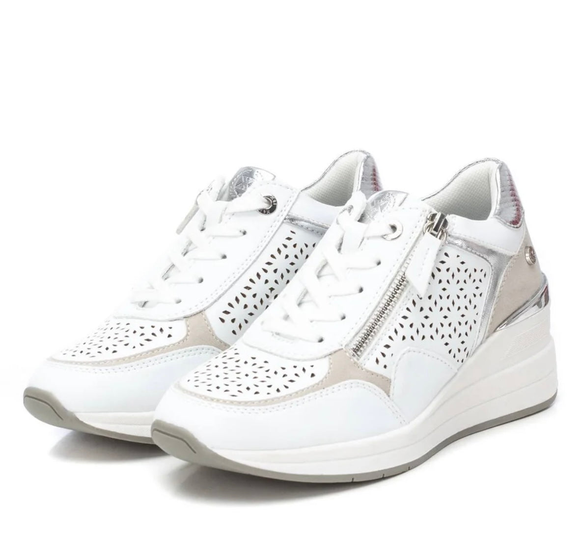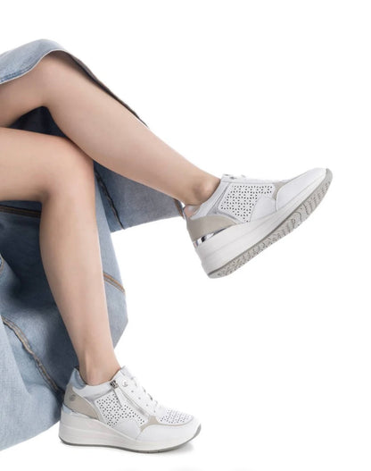 Women's trainers, from the Xti brand. Made from material that imitates leather with decorative die-cut detailing. Zip fastening. With removable insole. Wedge with non-slip rubber sole. Ideal for adding a few centimetres without losing comfort. This model has been certified vegan by the worldwide organisation PETA (Animal Rights Organisation).