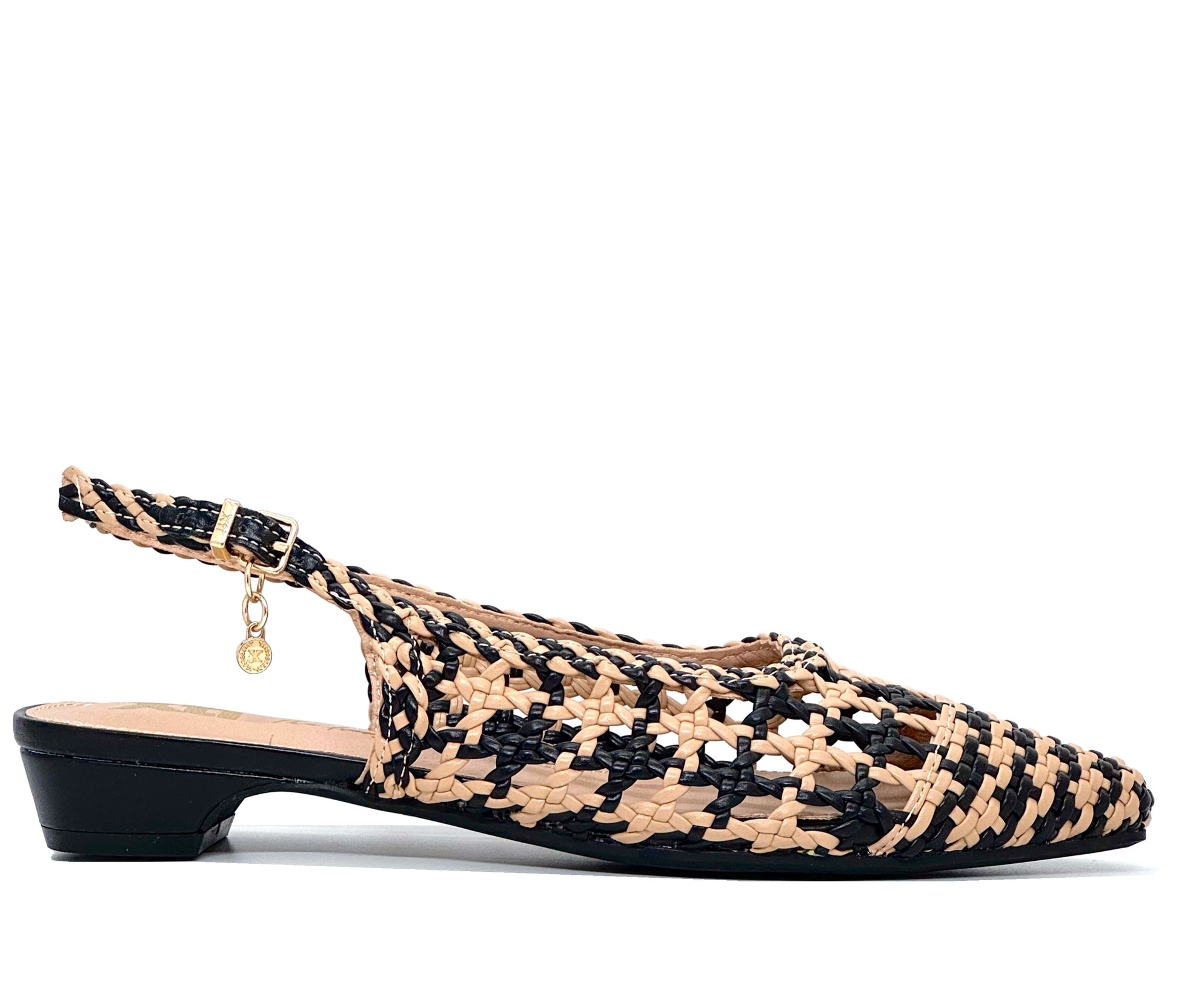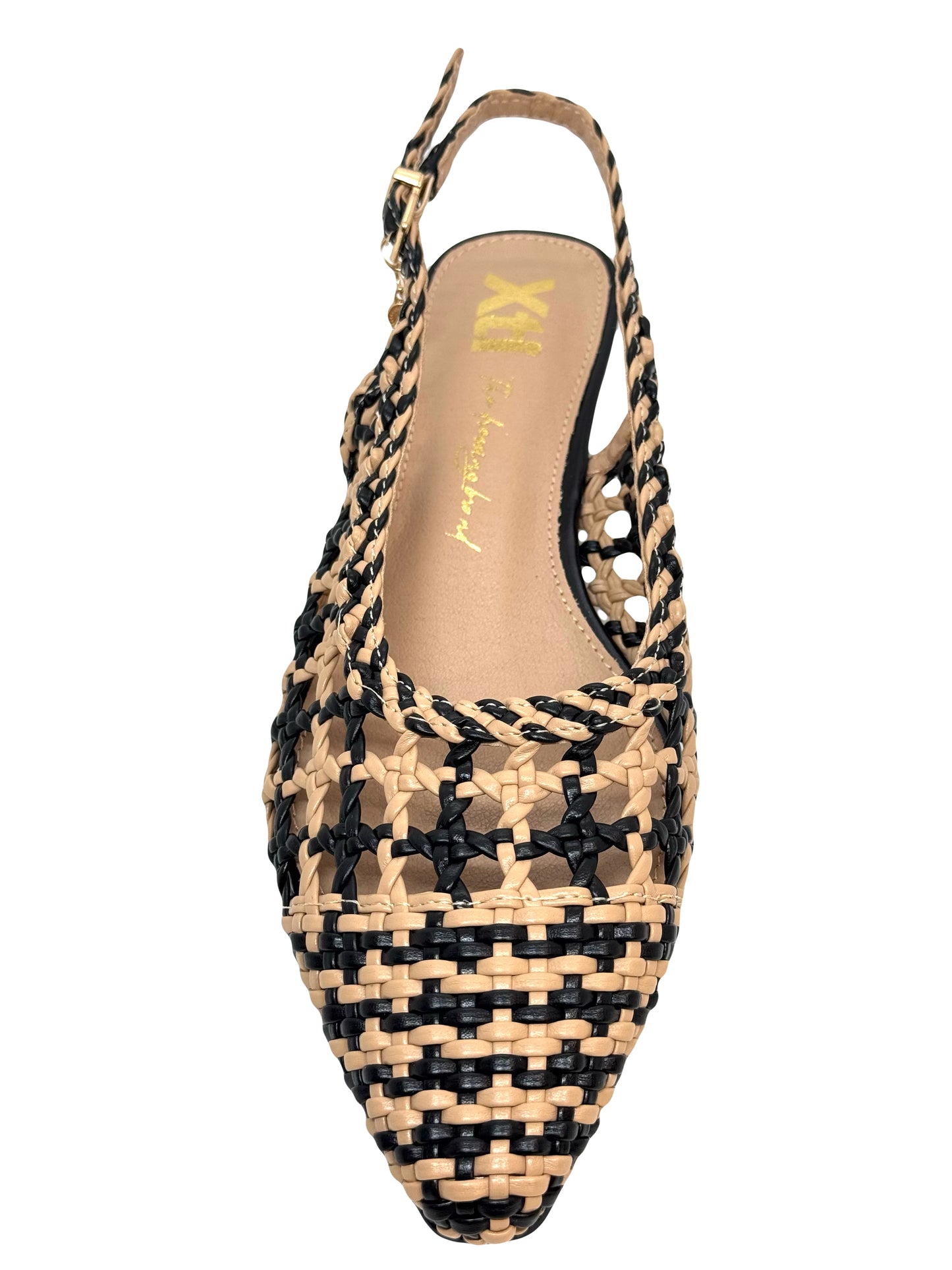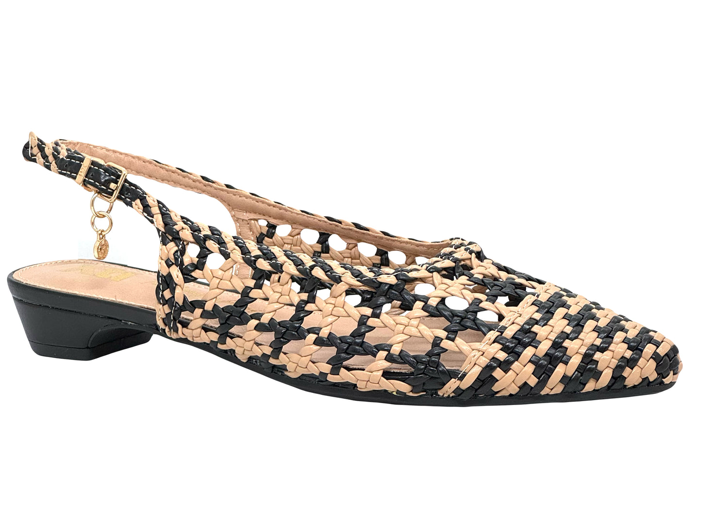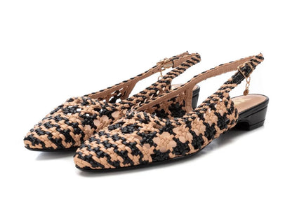 Ballerina for women, Xti brand. Made of material that imitates leather, combined in two colours. Model of fine tip, heeled. Fastening to the ankle with buckle. Flat and non-slip sole. This model has obtained the vegan certificate by the worldwide organization PETA (Animal Rights Organization).