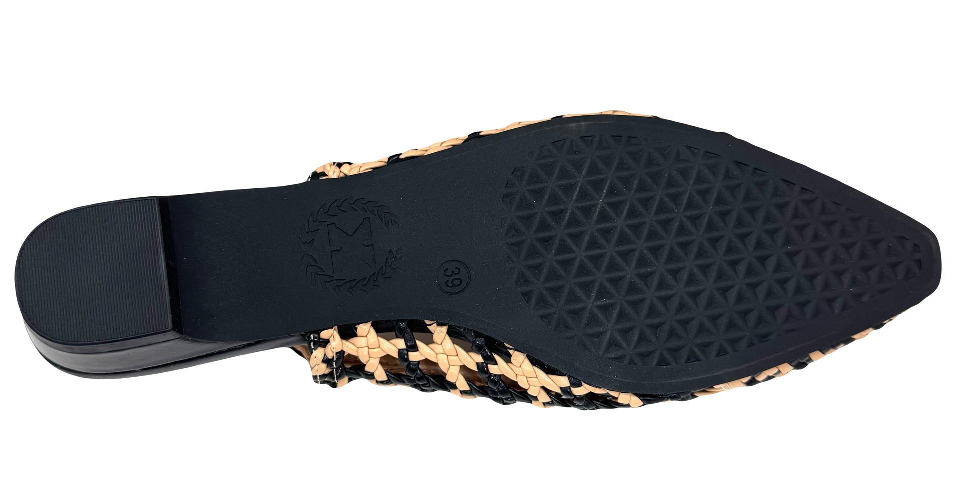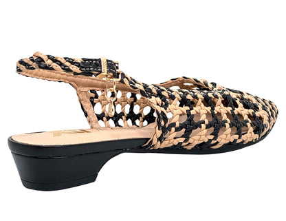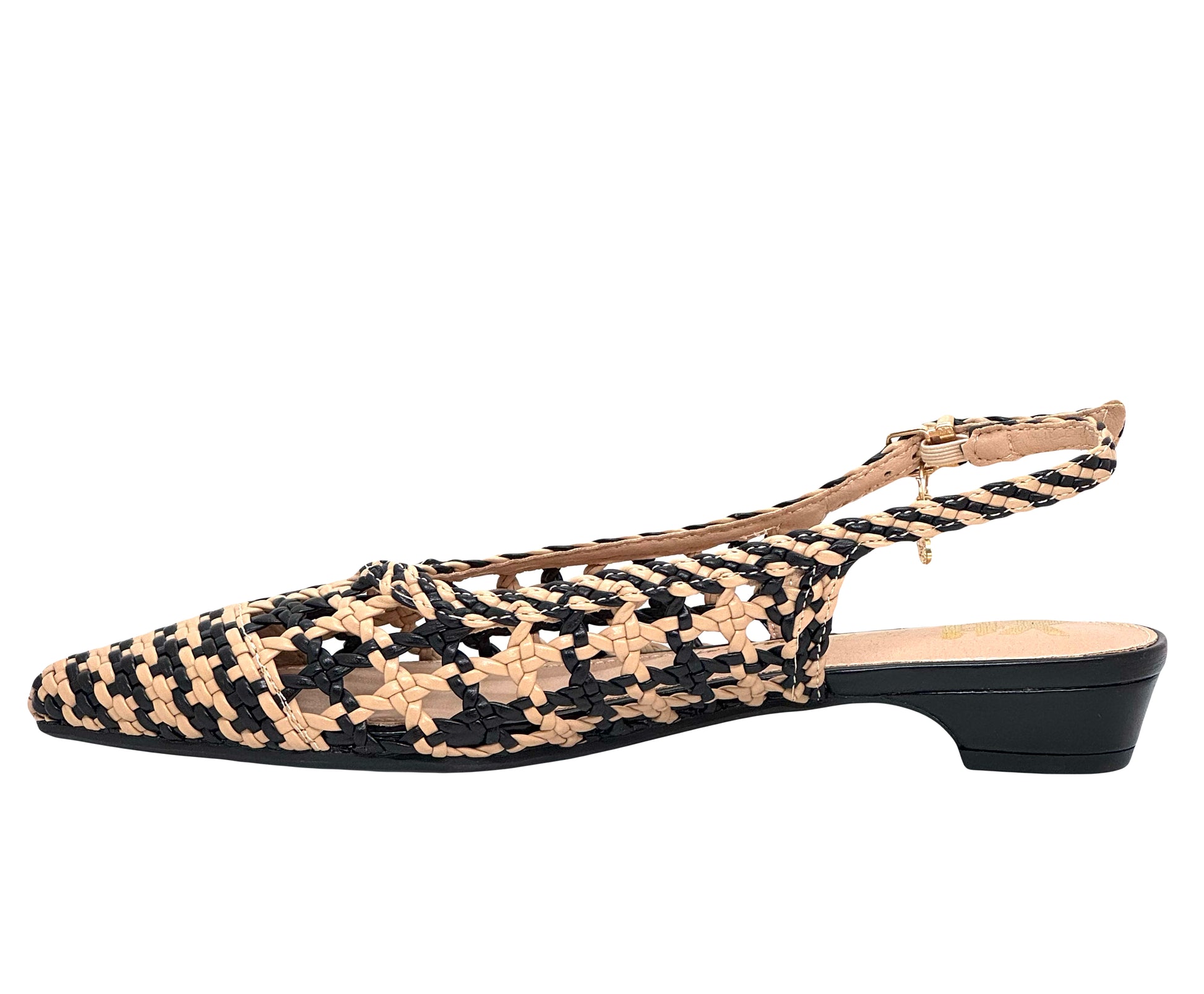 Ballerina for women, Xti brand. Made of material that imitates leather, combined in two colours. Model of fine tip, heeled. Fastening to the ankle with buckle. Flat and non-slip sole. This model has obtained the vegan certificate by the worldwide organization PETA (Animal Rights Organization).